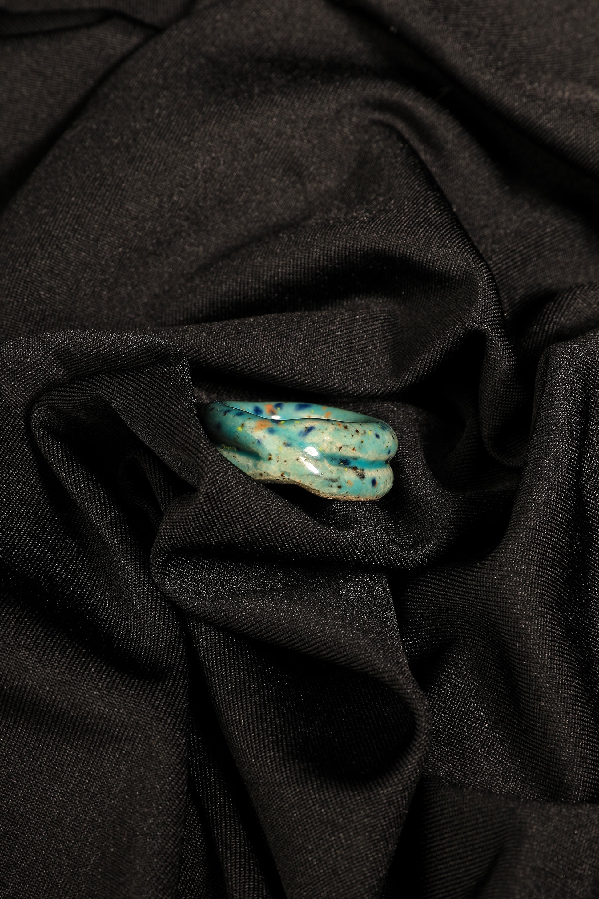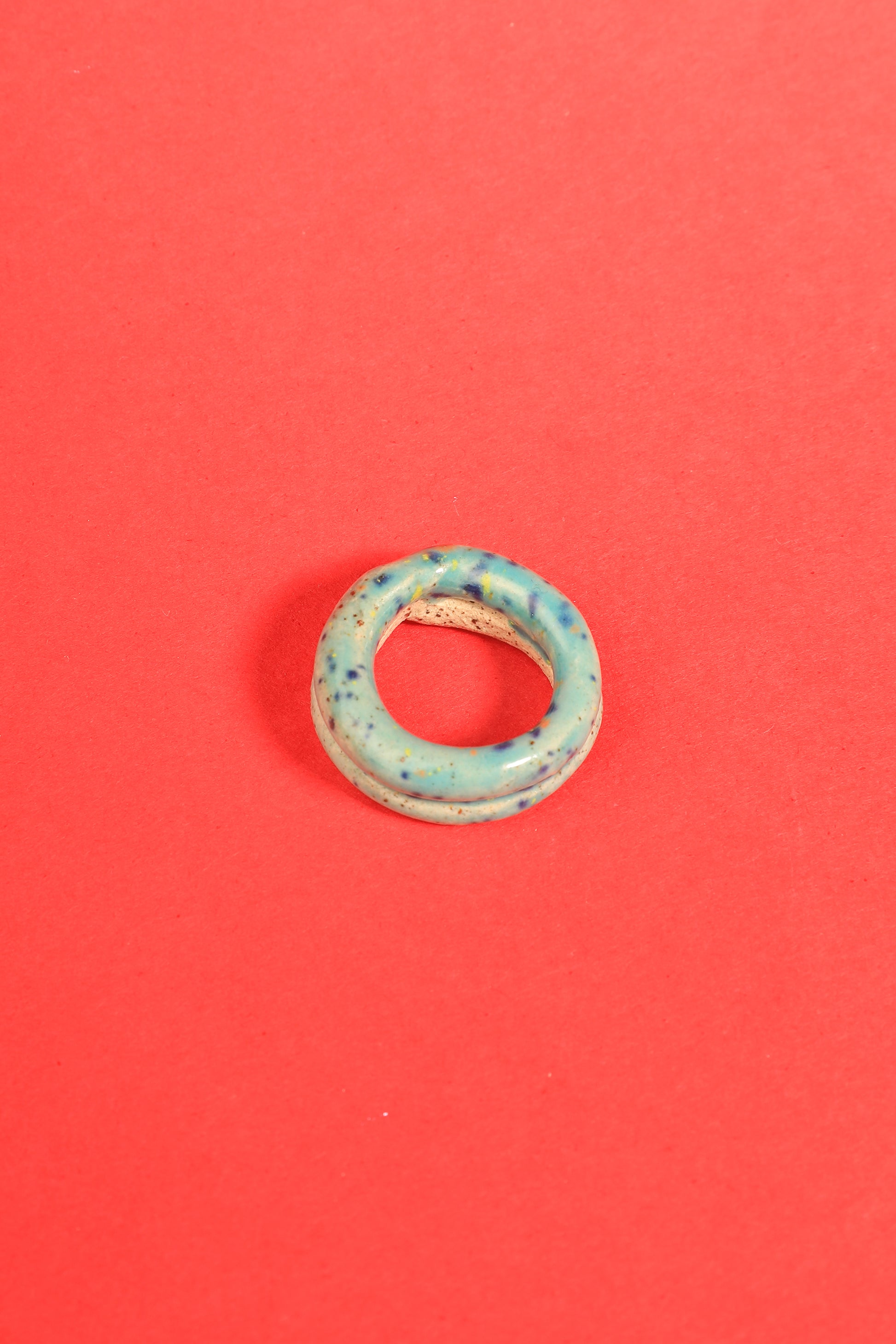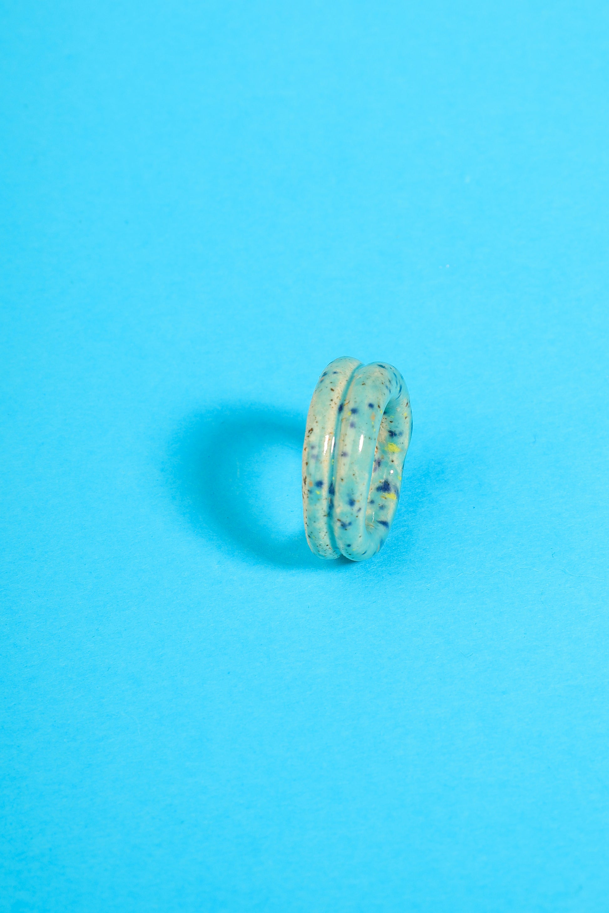La bague colombin est un retour à l’essence même de la céramique. Modelée à la main en terre blanche, elle s’enroule autour du doigt avec douceur, comme pour rappeler les gestes ancestraux de celles et ceux qui, depuis des millénaires, façonnent l’argile. Son émail bleu moucheté de nuances multicolores, posé délicatement au-dessus, vient capter la lumière et souligner sa forme brute mais pleine de caractère.