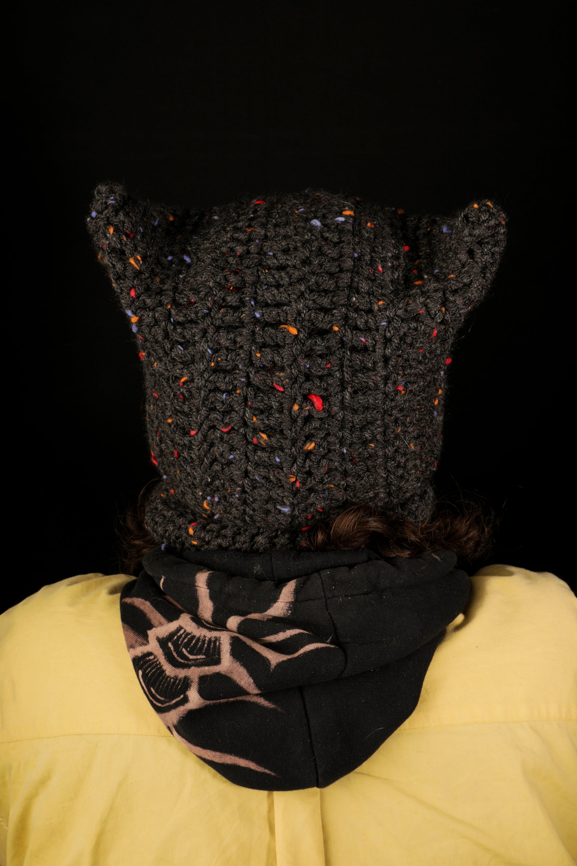 Ce bonnet noir moucheté, agrémenté de ses oreilles de chat, apporte à la fois chaleur et personnalité à votre tenue. Sa laine douce et souple enveloppe la tête avec tendresse, tandis que ses petites oreilles apportent une touche espiègle, rappelant la malice et la curiosité de nos amis enfants ou félins. *joke*