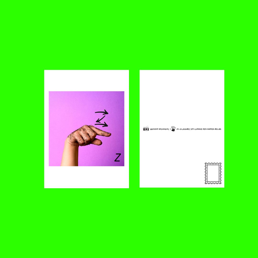 Cette carte postale capture un geste simple et essentiel : la lettre Z de l’alphabet en langue des signes francophone belge. Pensée au départ comme une manière d’illustrer chaque lettre pour composer une affiche, elle se décline ici en format carte afin d’inviter chacun à jouer avec ce langage silencieux.