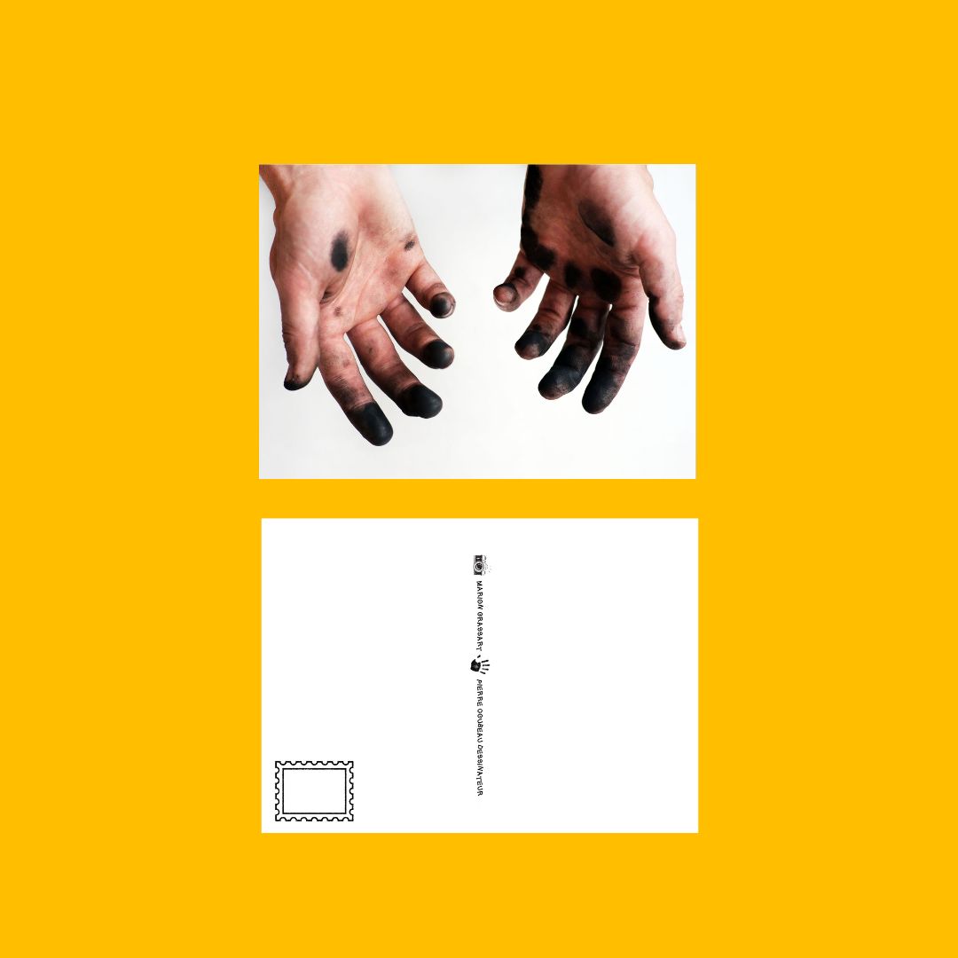 Cette carte postale n’est pas un simple support : c’est un fragment d’un langage universel, celui des mains. Ici, ce sont celles d’un dessinateur, photographiées comme un présentoir brut et expressif. Rien de plus qu’elles, couvertes de noir, marquées par la poudre de fusain au bout des doigts.