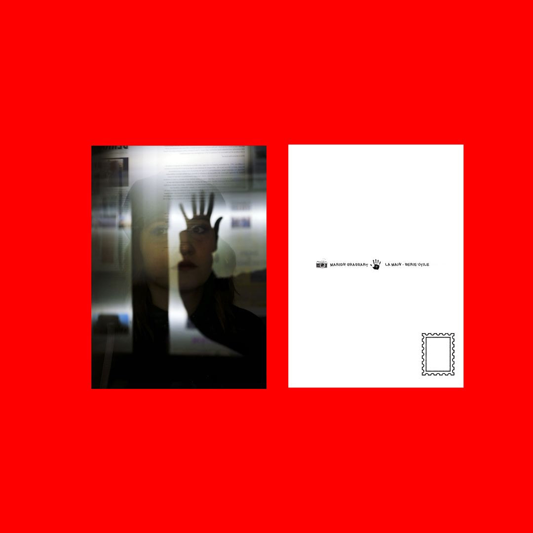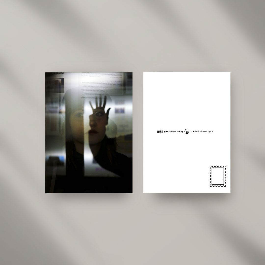 Cette carte postale n’est pas un simple support : c’est un fragment d’un langage universel, celui des mains. Ici, il s’agit du portrait d’une personne, captée derrière une vitre, où se superpose le reflet de sa propre main sur son visage. Une image à la fois intime et mystérieuse, qui joue avec la transparence et la profondeur.
