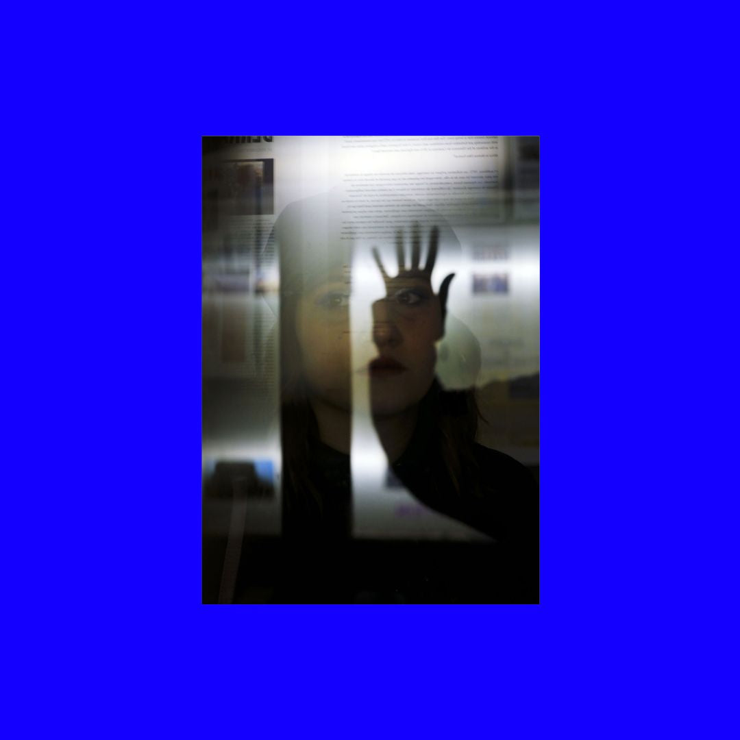Visuel : Photographie originale de Marion Grassart – portrait derrière une vitre, main en reflet sur le visage