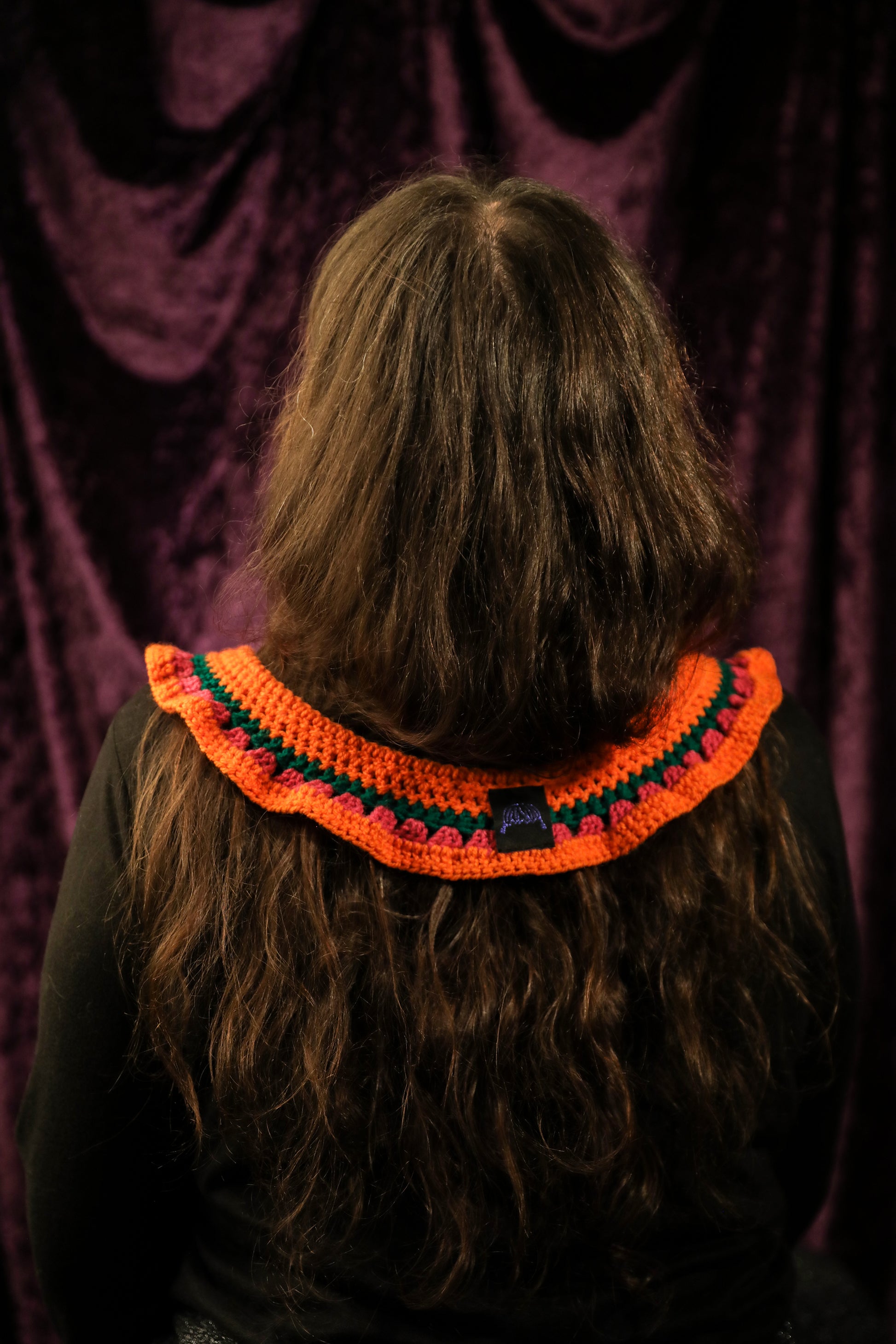 Ce col pèlerine aux teintes orange, rose et vert profond est une promenade douce et joyeuse dans un jardin textile.