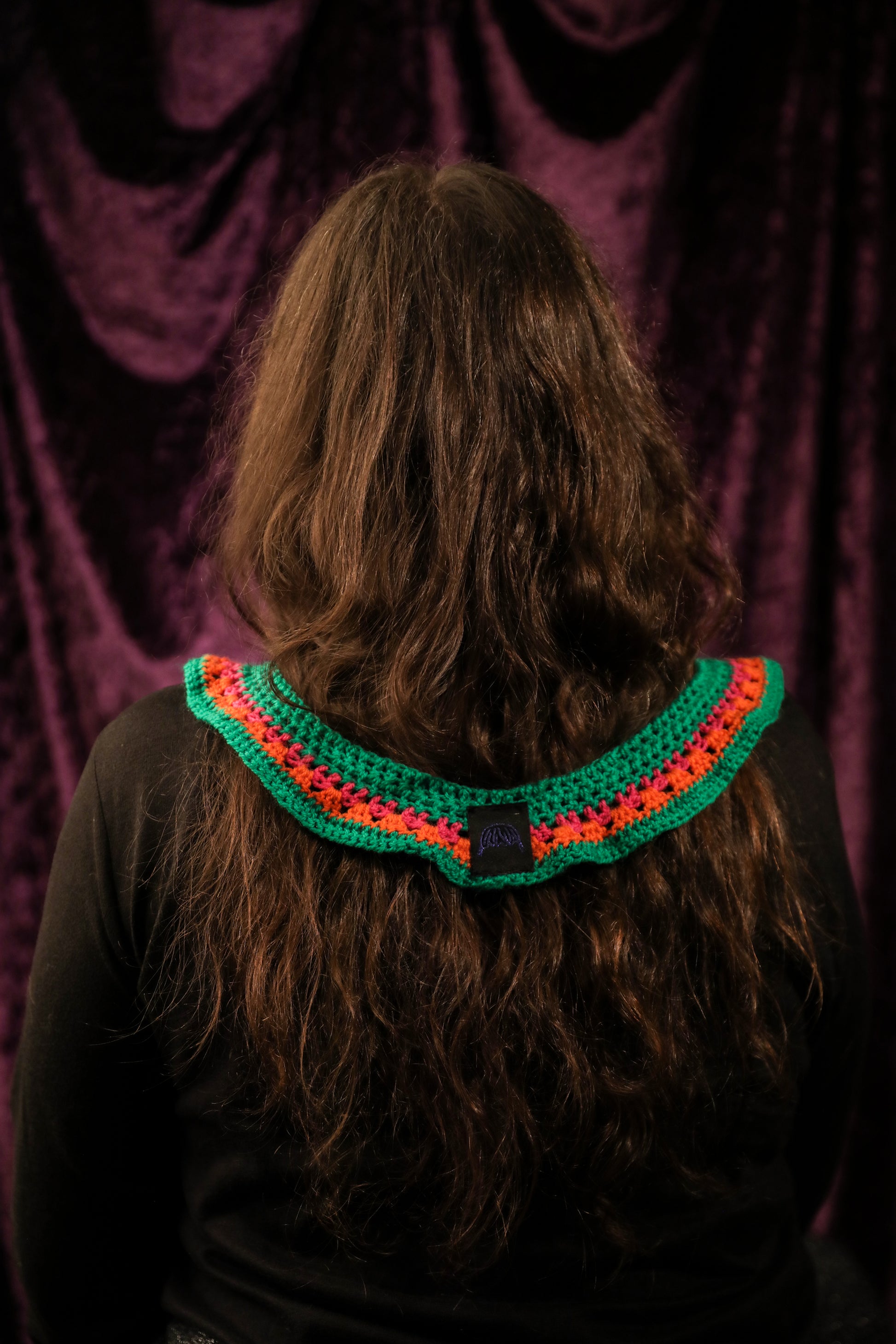 Ce col pèlerine est une promenade sensorielle à lui seul. Son vert tendre enveloppe comme un feuillage rassurant, tandis que le rose délicat et l' orange au centre viennent y déposer des touches de fruits mûrs et de fleurs en éveil.