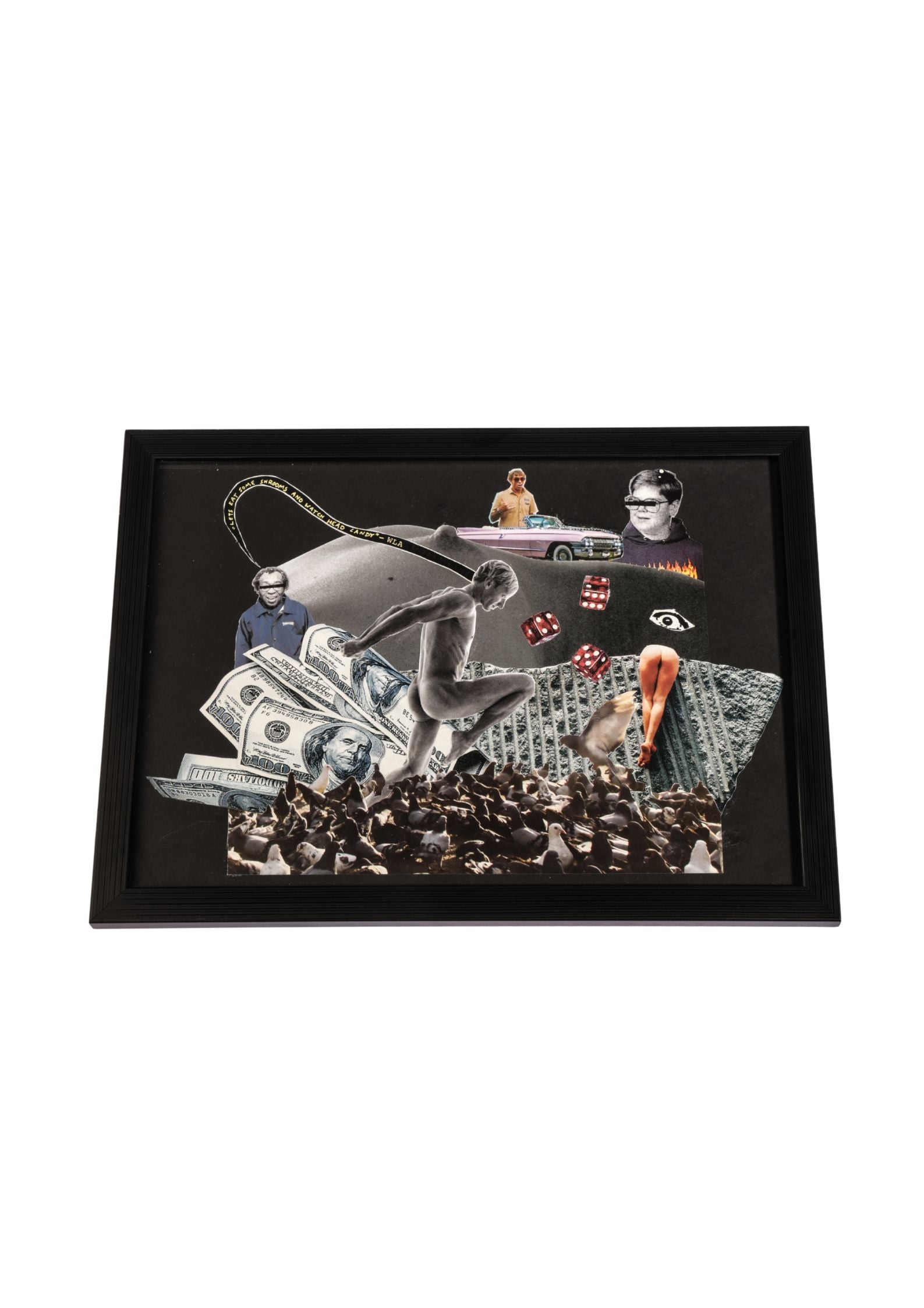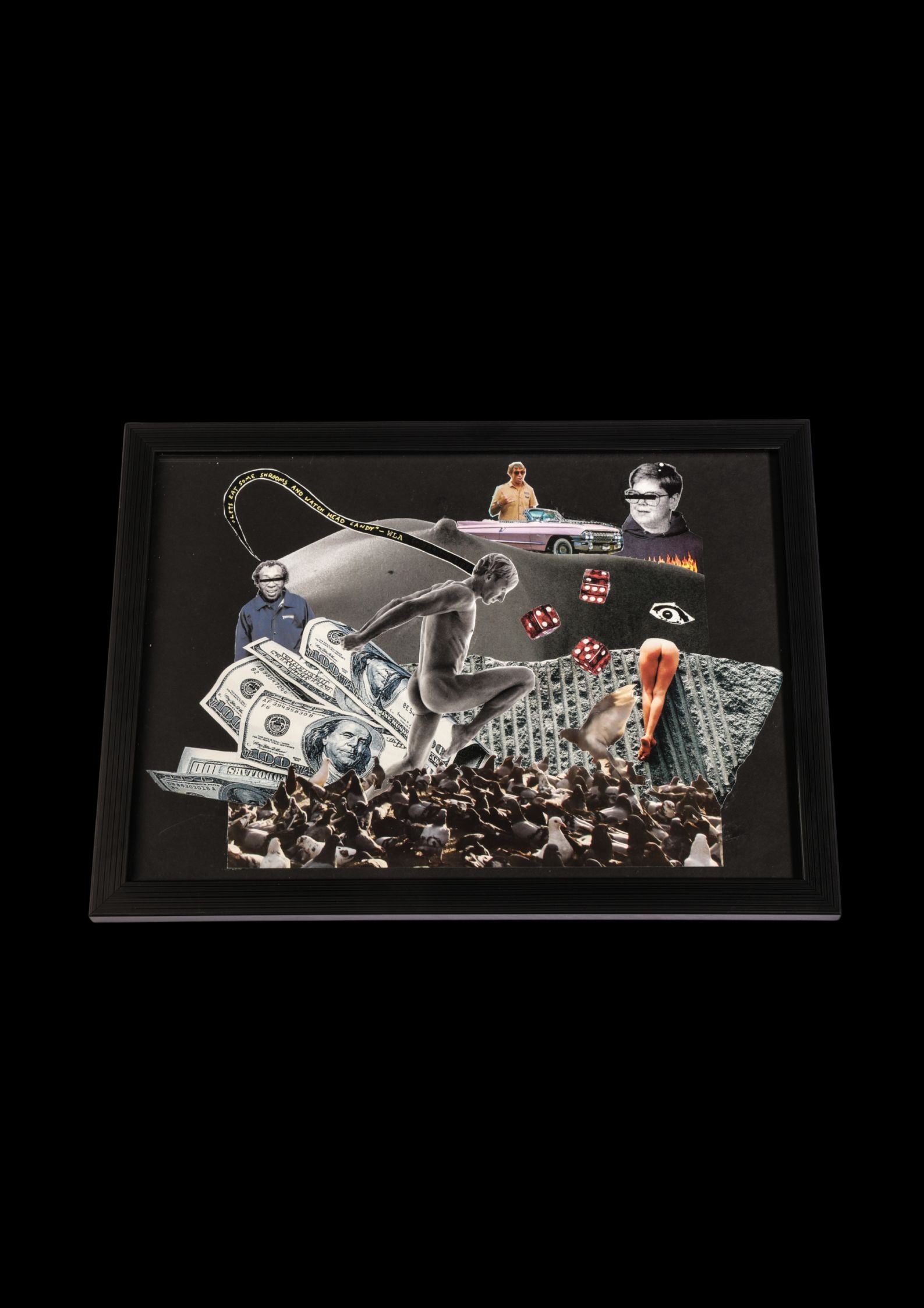 Un autre homme, à gauche, lit un message envoyé par le plongeur du centre : “Let’s eat some shrooms and watch head candy…” — comme une invitation ironique à fuir la réalité par l’excès, l’illusion ou l’oubli. Surplombant le tout, un œil veille, posé au-dessus des fesses et des dés : regard divin ou simple témoin, il incarne la surveillance, la chance ou le destin qui nous observe.