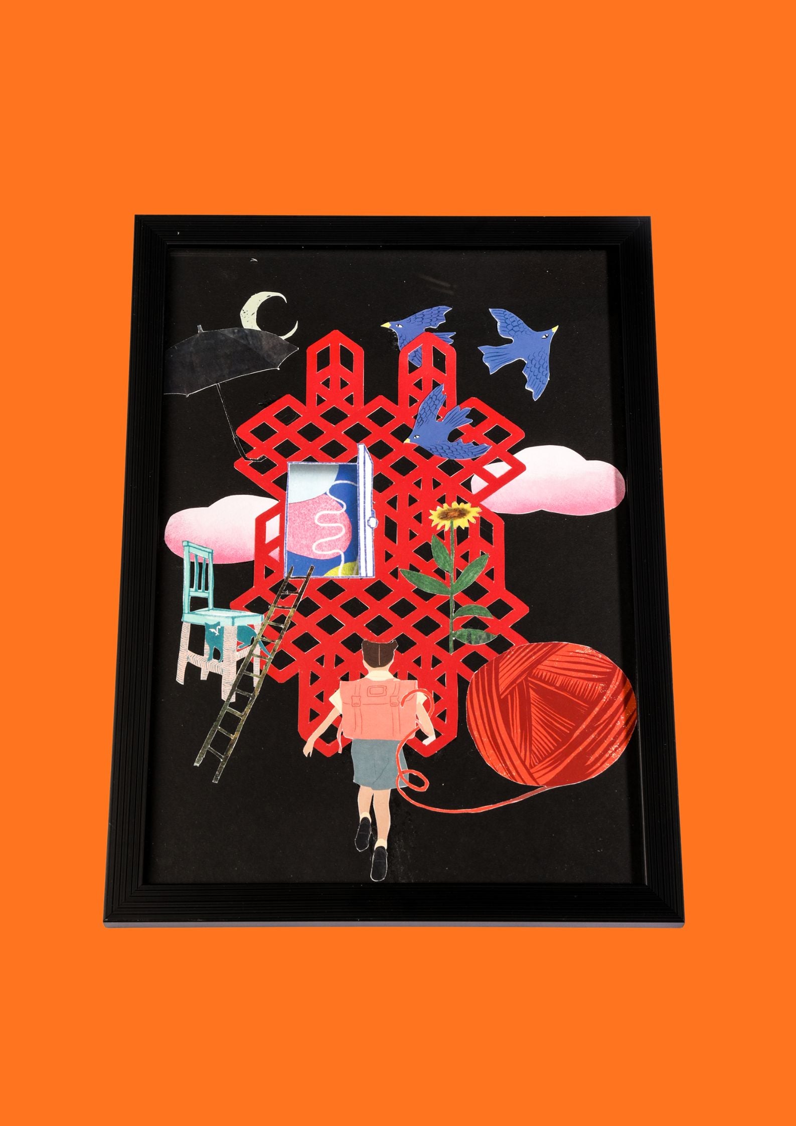 Cette œuvre n’est pas un simple collage : c’est une invitation à traverser un univers onirique, à mi-chemin entre rêve et imaginaire. Au premier regard, une petite fille s’avance vers une construction géométrique qui évoque un labyrinthe. À ses côtés, une imposante pelote de laine se déroule comme un fil conducteur, symbole de cheminement et de quête.