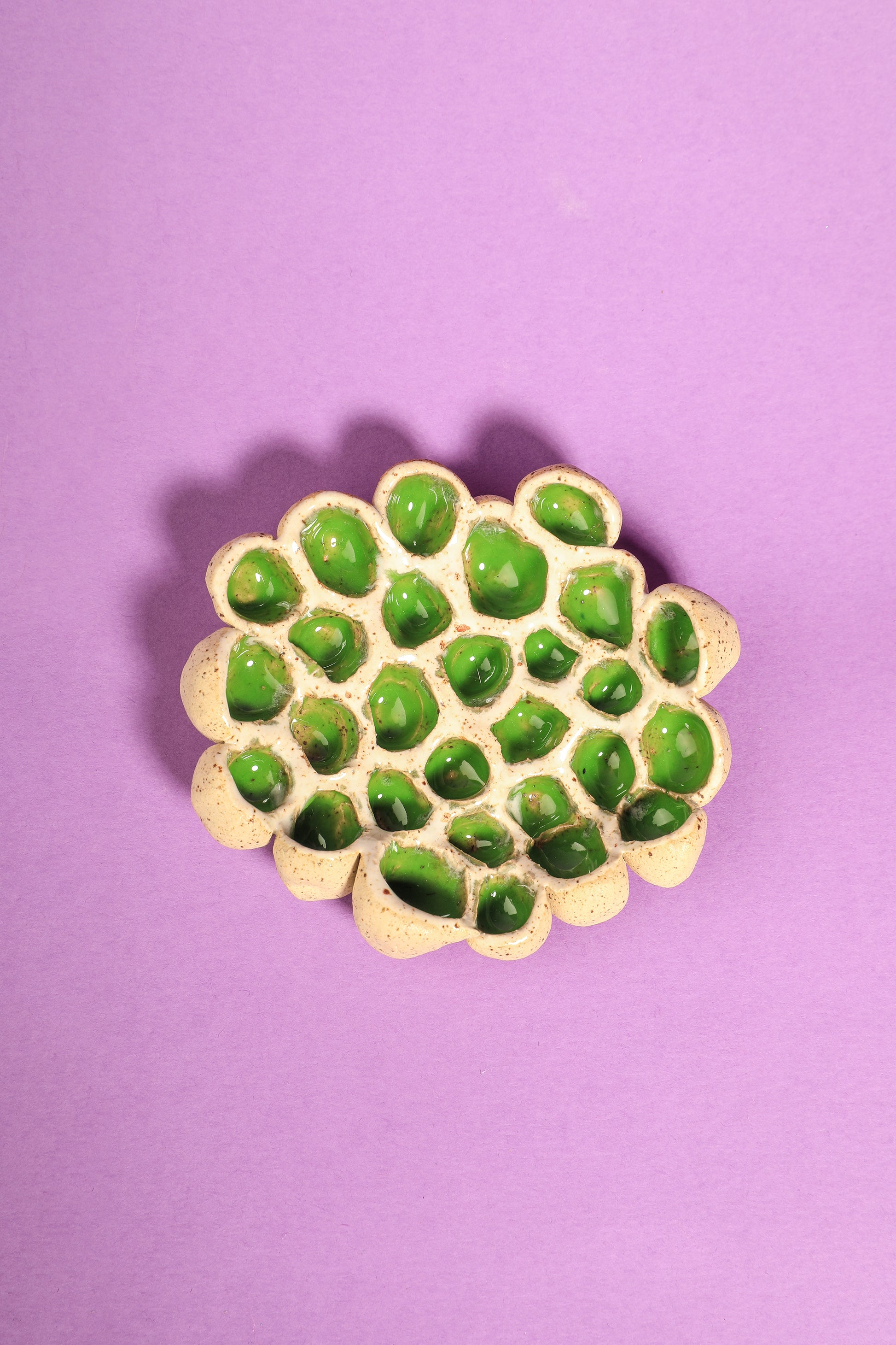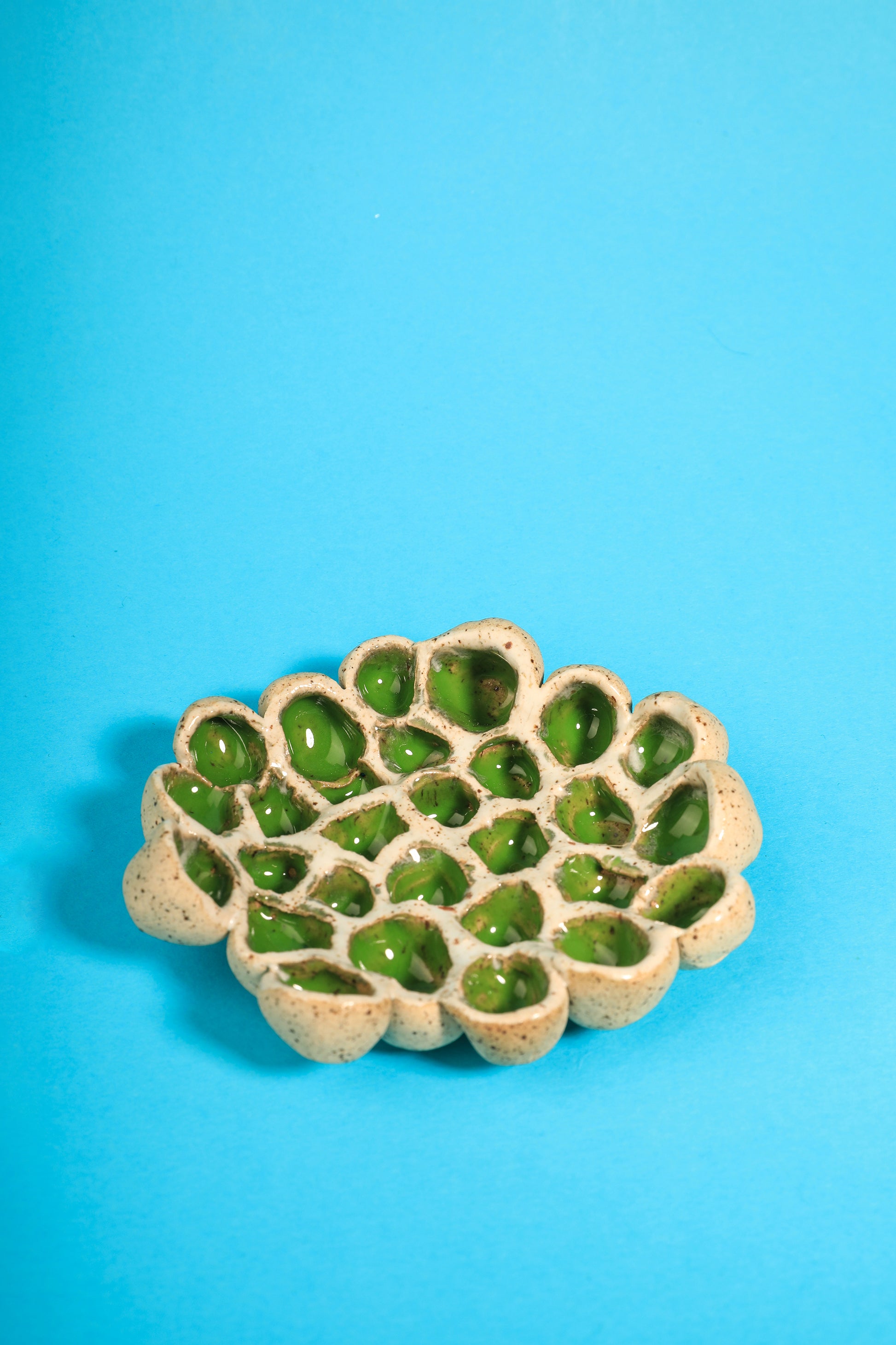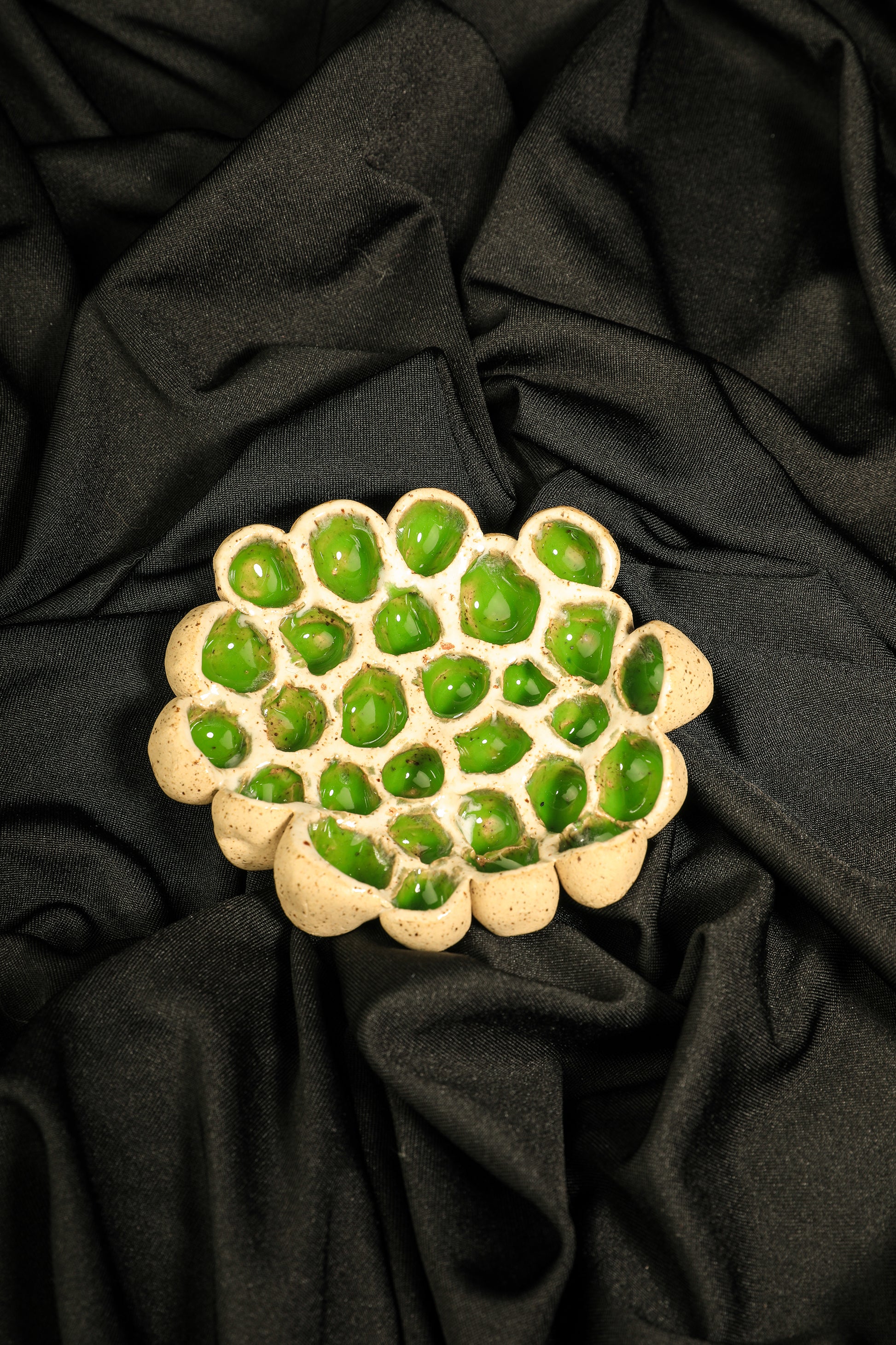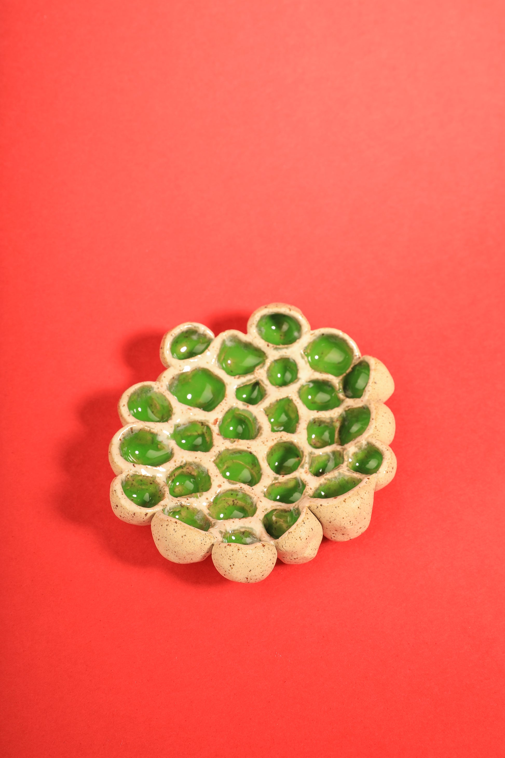 Cette petite coupelle semble être née d’un éclat de forêt enchantée. Ses bords blancs et irréguliers, contrastant avec l’intérieur vert profond, évoquent des feuilles délicates caressées par la lumière. L’extérieur, couleur de terre beige ponctuée de petites tâches, rappelle la beauté brute et naturelle du sol où poussent les secrets de la nature. Les multiples petits trous qui parsèment la coupelle lui donnent une légèreté presque magique, comme si elle pouvait laisser passer des rayons de soleil capturés dans un rêve.
