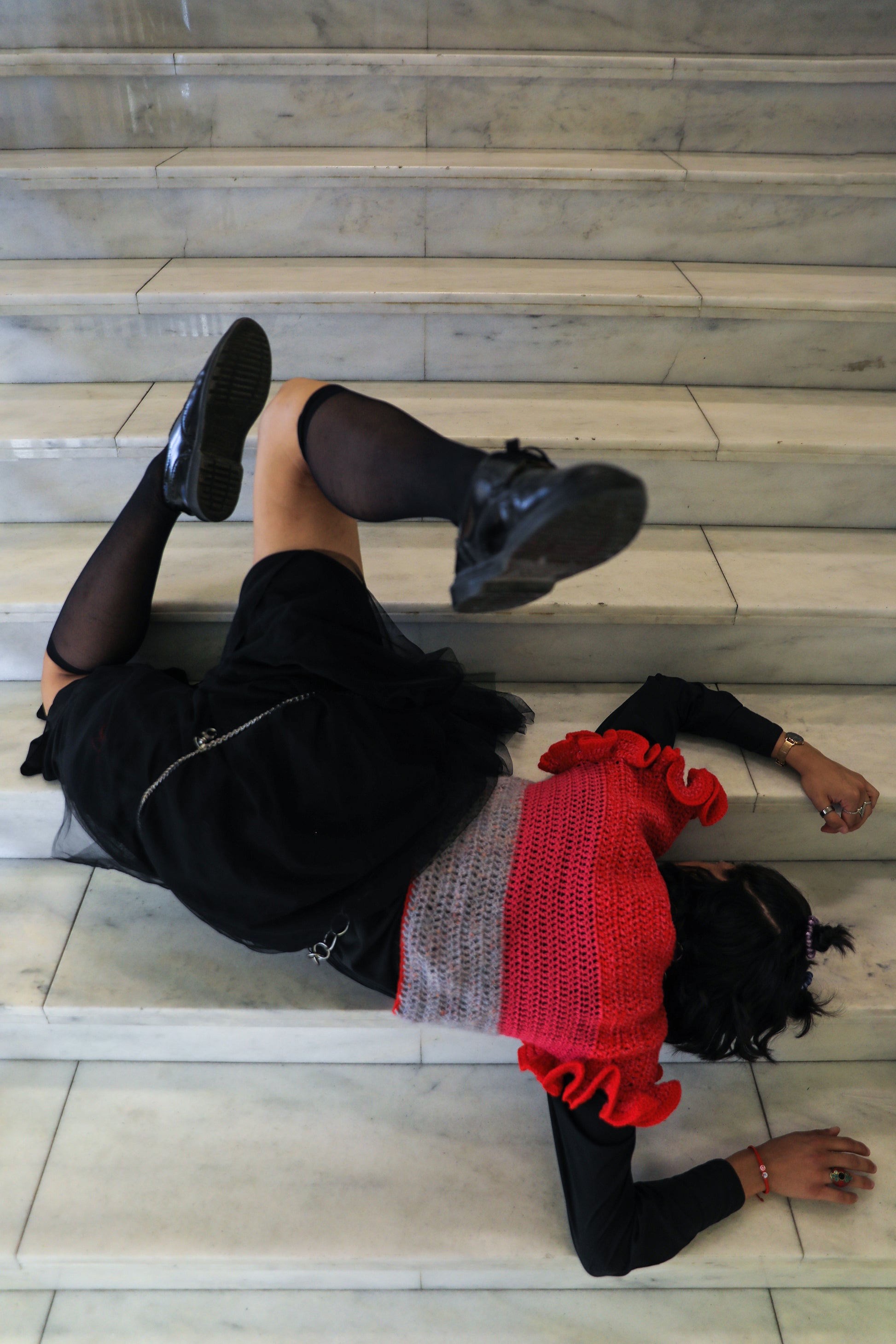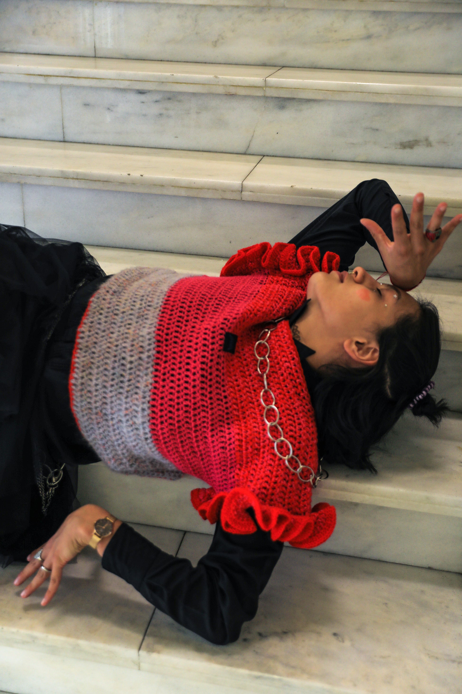 Confectionné en mélange de laines, dont une partie (la partie basse) provient de laine de récup grise et rouge au charme brut et authentique, il mêle histoires passées et spontanéité présente. Le milieu en rose vient adoucir l’ensemble, tandis que le haut du pull en rouge profond affirme son caractère lumineux et audacieux. Ses manches virevoltantes, faites d’un mélange de rouge et de rose, ajoutent une touche dansante et espiègle, comme des ailes en mouvement ; parfait pour les âmes qui papillonnent entre intensité et tendresse. La coupe courte laisse respirer la silhouette, pour les jours où l’on veut se sentir vive et légère.