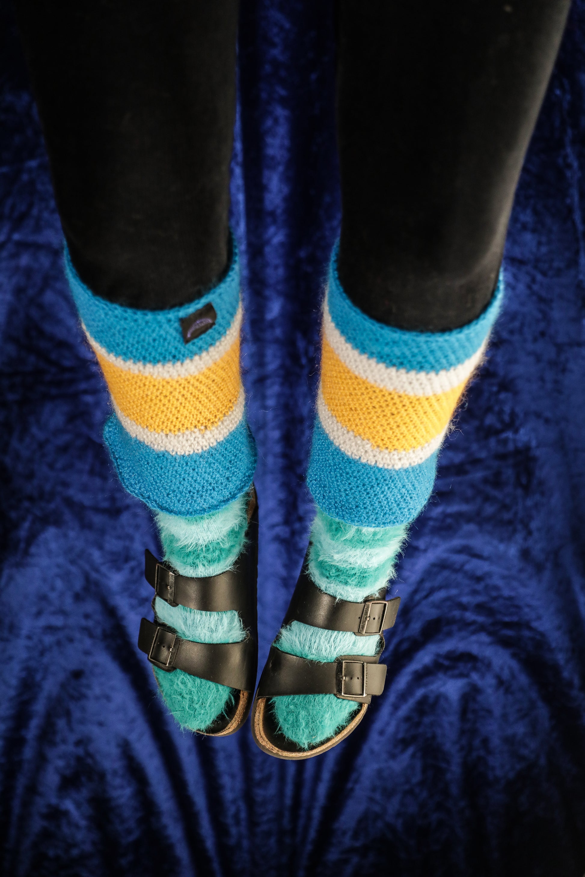 Ces guêtres rayées bleu, jaune et gris sont comme un petit clin d' oeil aux matins lumineux et aux après-midis à courir dans les flaques. Elles réchauffent les chevilles avec juste ce qu'il faut de moelleux, tout en ajoutant une touche rythmée à votre silhouette.