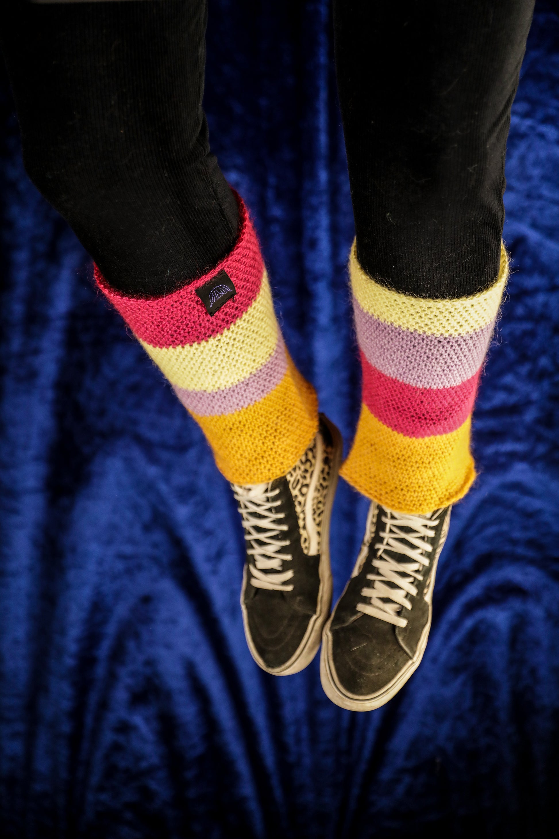 Ces guêtres ajoutent une touche sucrée à n' importe quelle silhouette. Leur palette de couleurs évoquent les bonbons acidulés, les souvenirs d' enfance, ou les illustrations d' un vieux livre jeunesse oublié sur une étagère. Elles apportent une touche de fantaisie dans votre outfits.