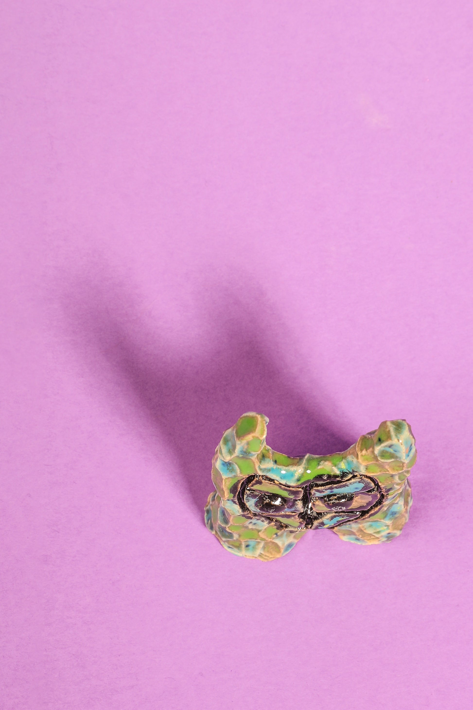 Composition : Terre blanche speckle / émaux verts, bleu moucheté et noir
