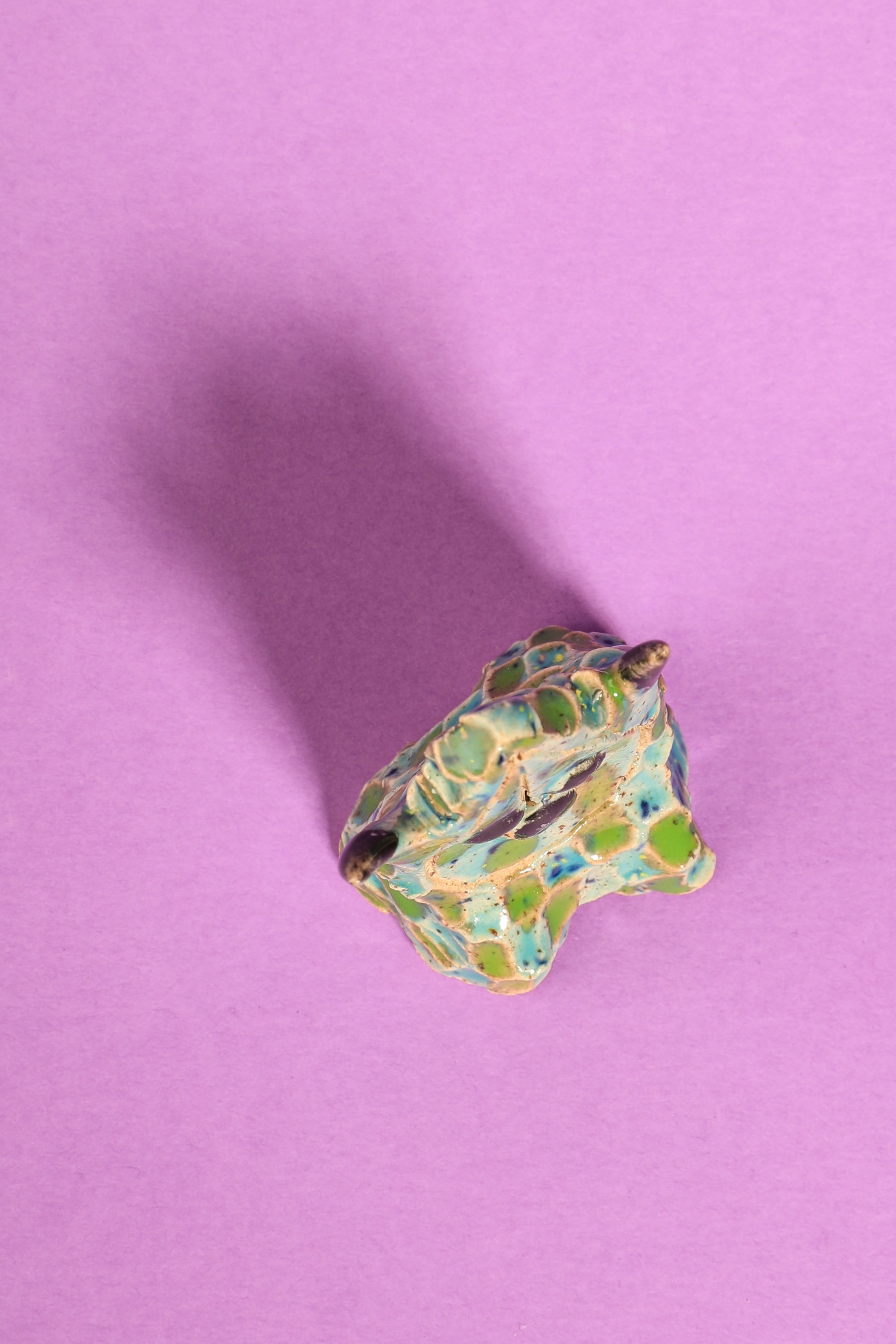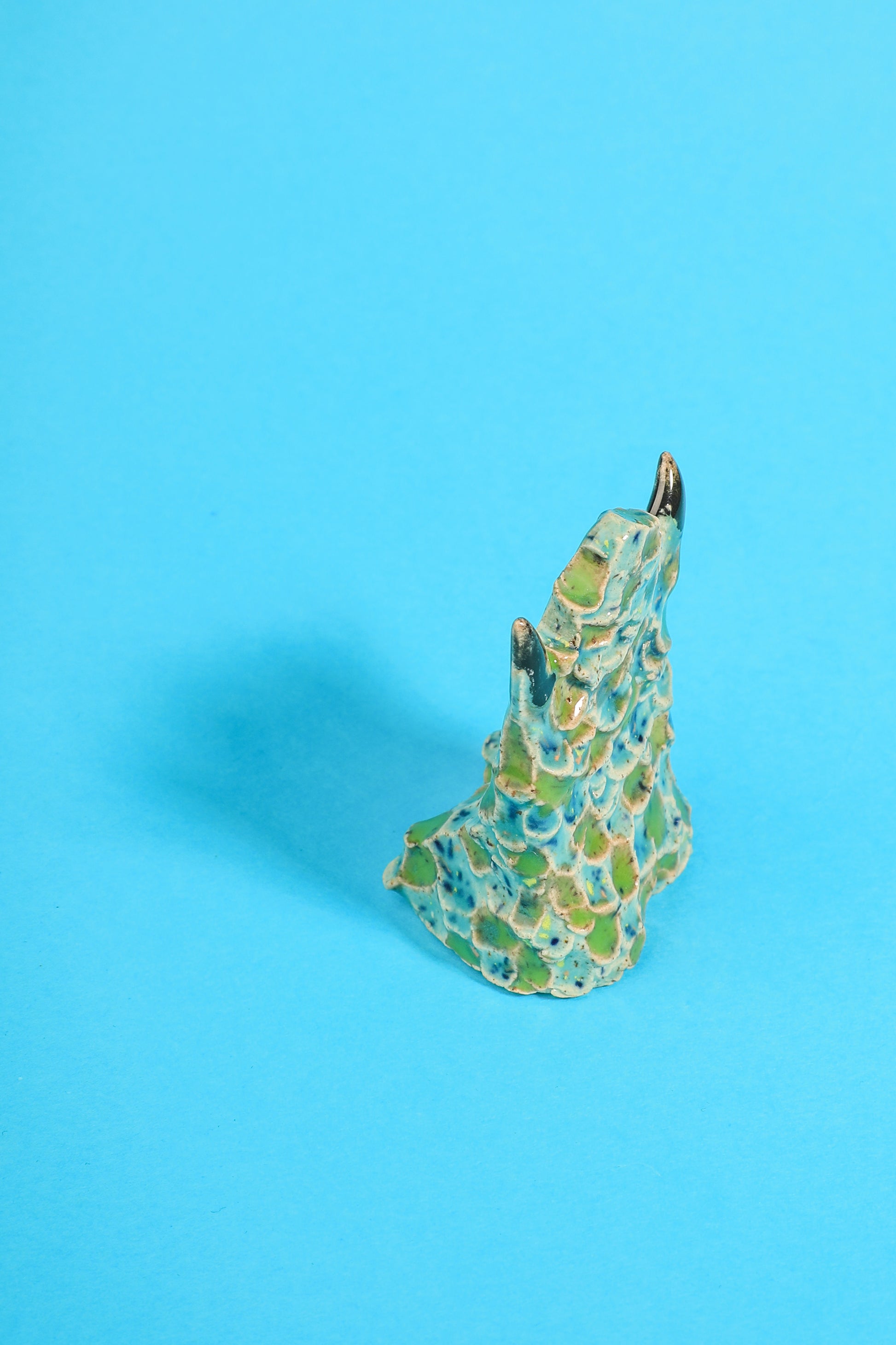 Composition : Terre blanche speckle / émaux verts, bleu moucheté et noir