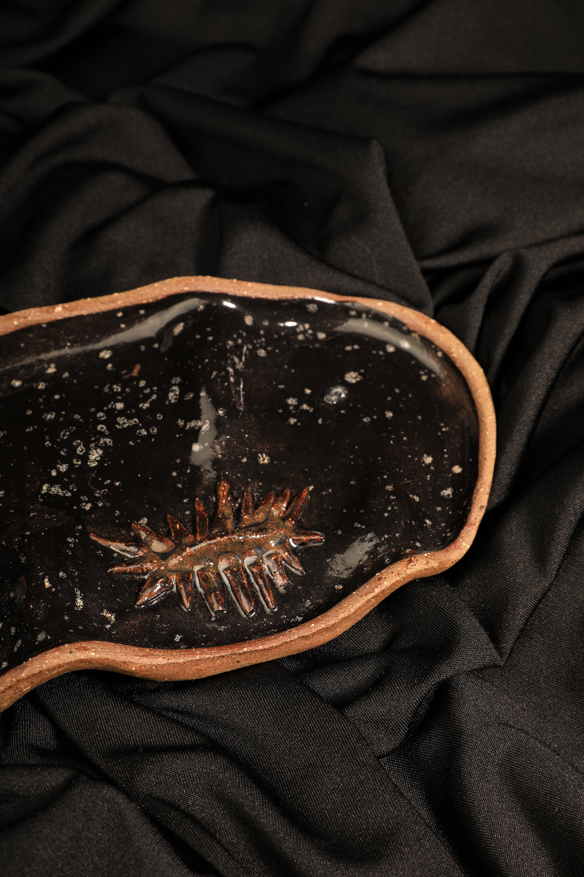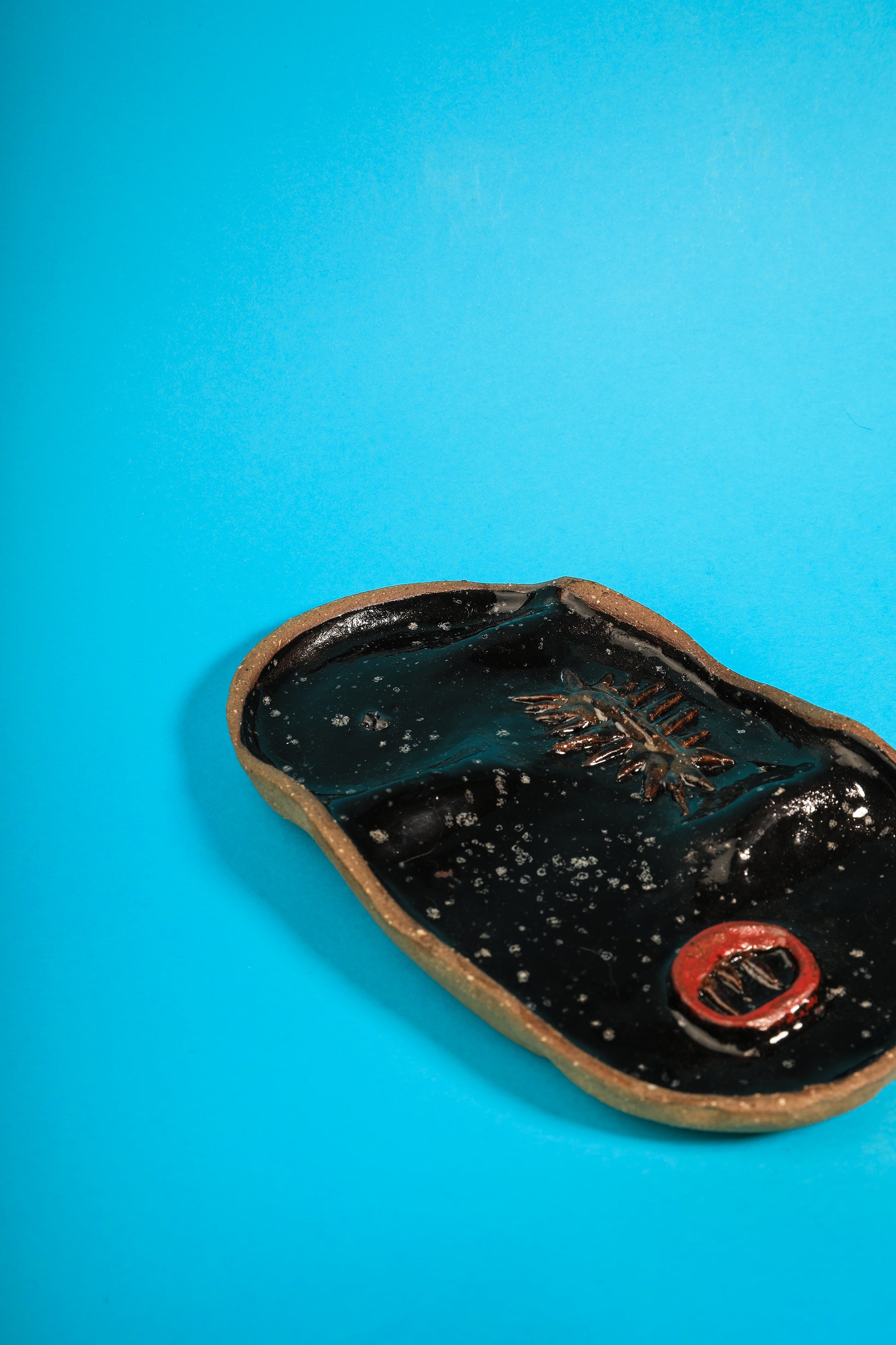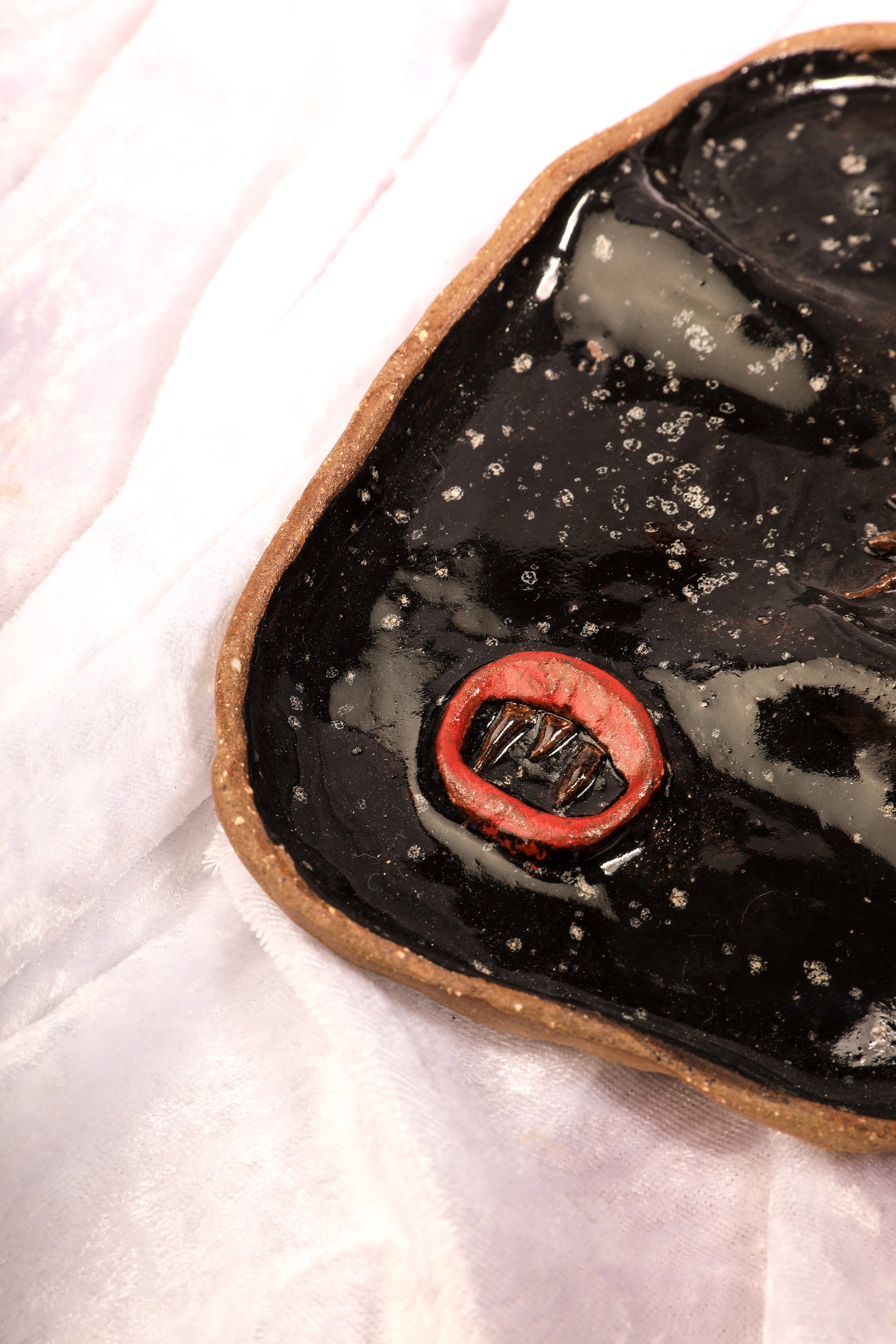 Émaillée de noir, elle joue avec l’ombre et la profondeur, donnant à ce visage monstrueux une aura mystérieuse, presque mythologique. On pourrait croire qu’il s’agit d’une relique sortie d’un autre monde, une petite divinité oubliée, gardienne d’histoires étranges. L’assiette n’est pas plate : elle semble respirer, onduler, comme si ce visage était prêt à nous chuchoter une fable nocturne ou un sortilège.