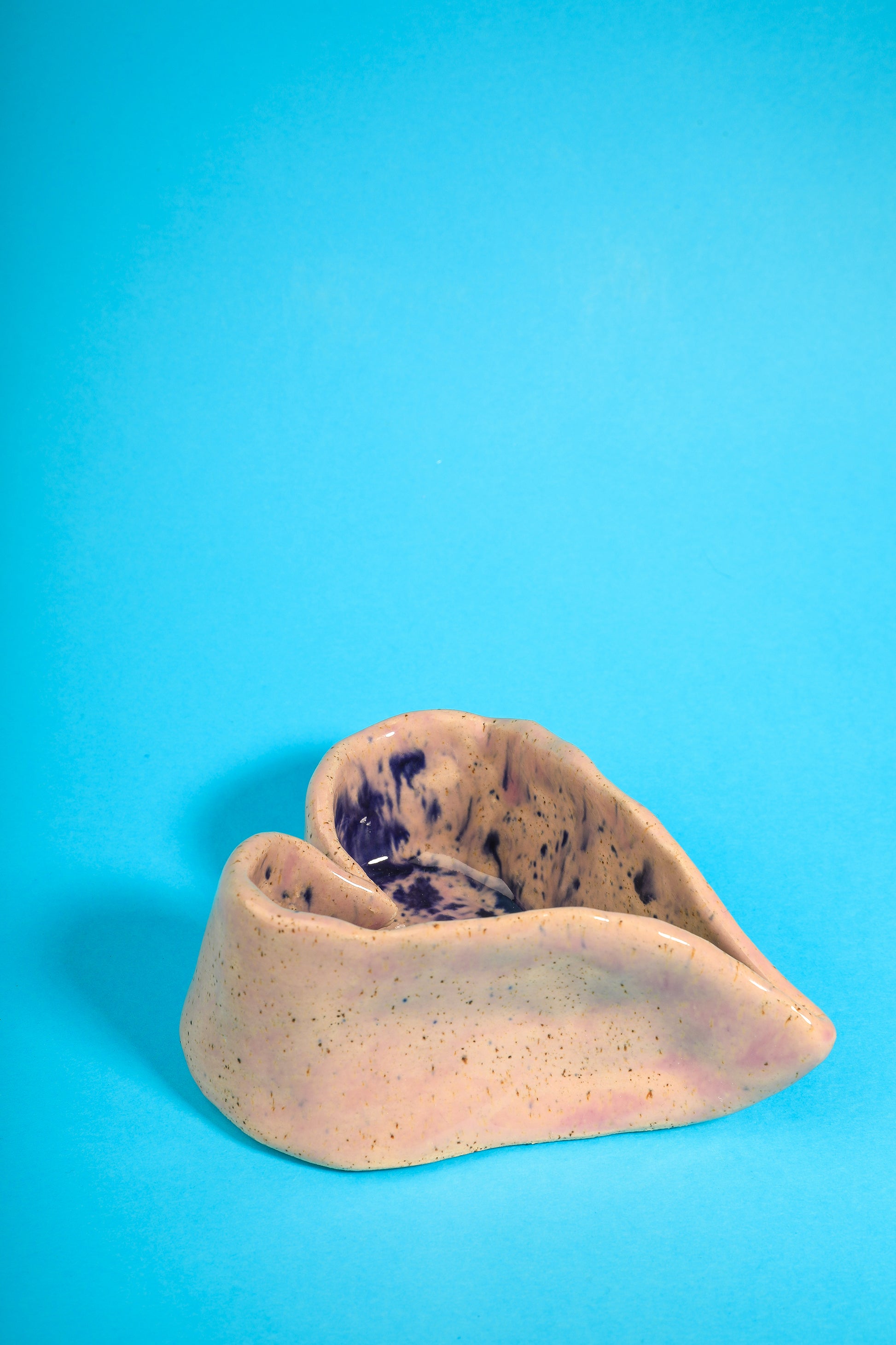 Réalisé en terre blanche speckle, il est habillé d’un extérieur rose tendre, tandis que l’intérieur se pare de mouchetés délicats dans les tons de rose et de bleu. Ces éclats de couleurs rappellent des éclaboussures joyeuses, comme si le pot avait gardé la trace d’une fête ou d’un souvenir coloré. Le contraste entre la sobriété de sa forme et la légèreté de ses nuances en fait un objet à la fois simple, espiègle et attachant.