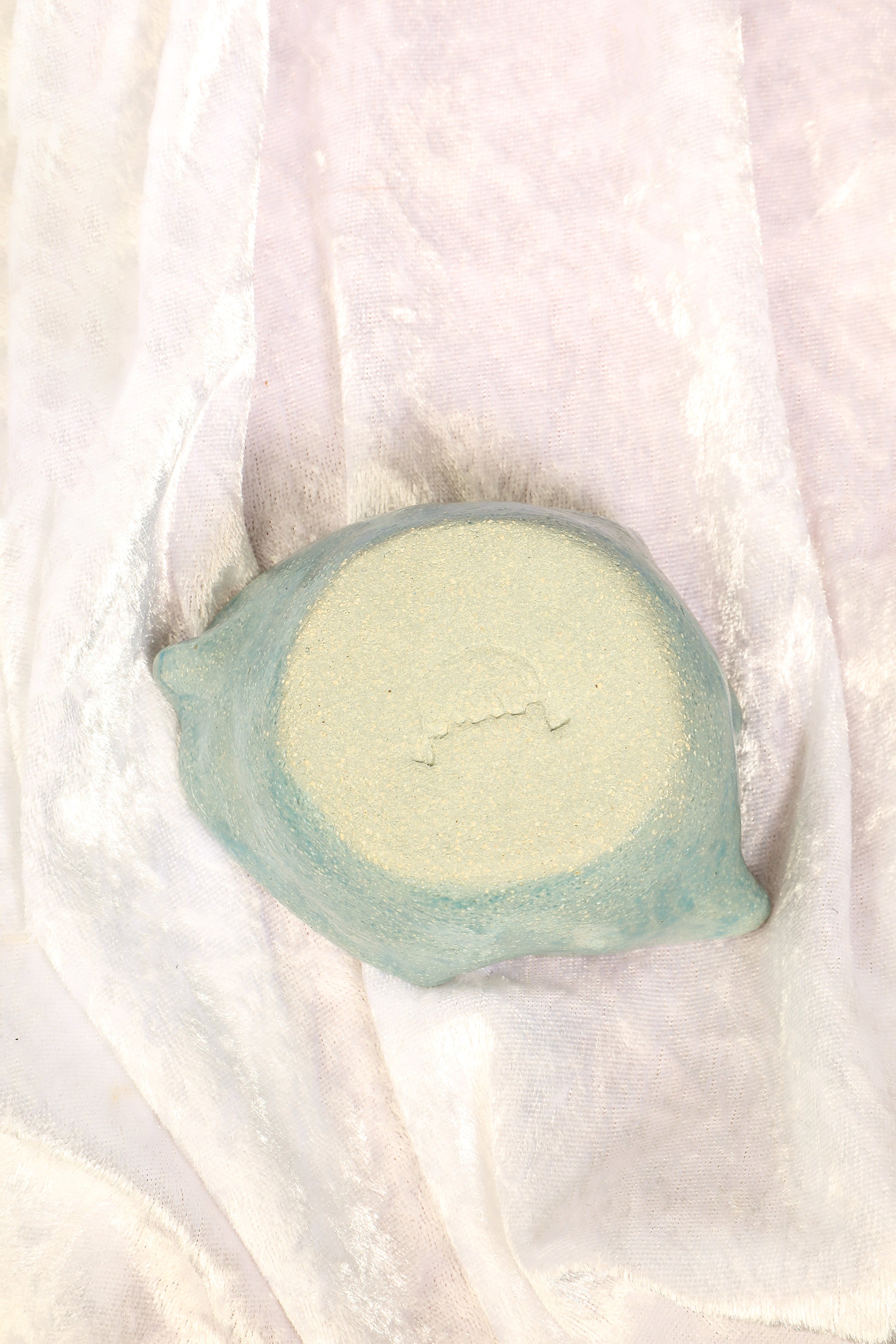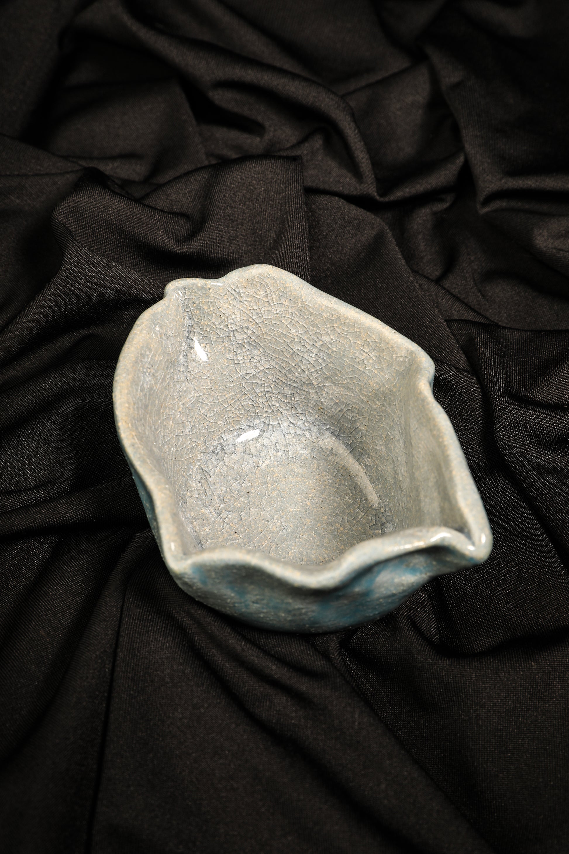 Façonné en terre bleue, il se pare d’un émail bleu à l’extérieur, la douceur qui souligne ses formes irrégulières, tandis que l’intérieur est recouvert d’un émail transparent légèrement craquelé, qui capte la lumière et crée un contraste fascinant entre douceur et éclat. Ce petit pot devient alors un objet à la fois pratique et poétique, capable d’accueillir une sauce, un condiment ou même une petite boisson, tout en offrant un vrai moment d’émerveillement au quotidien.