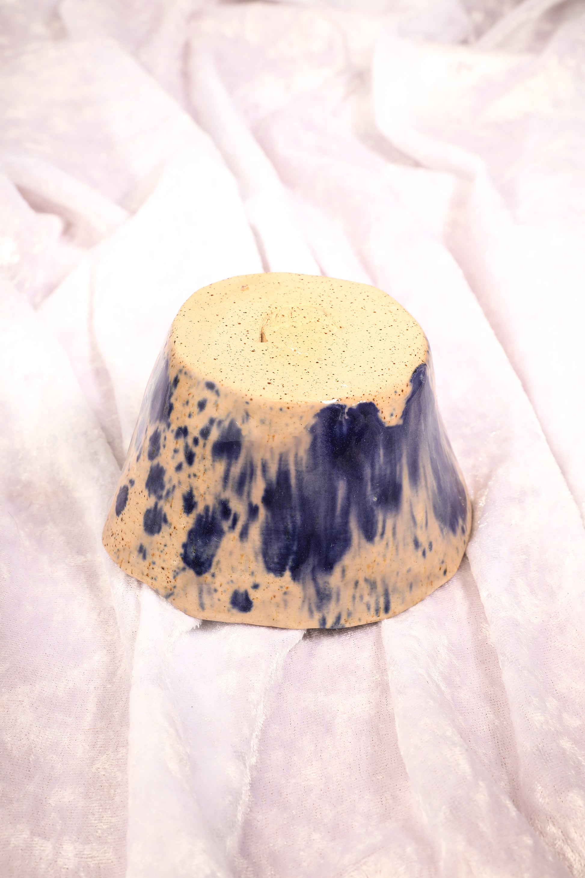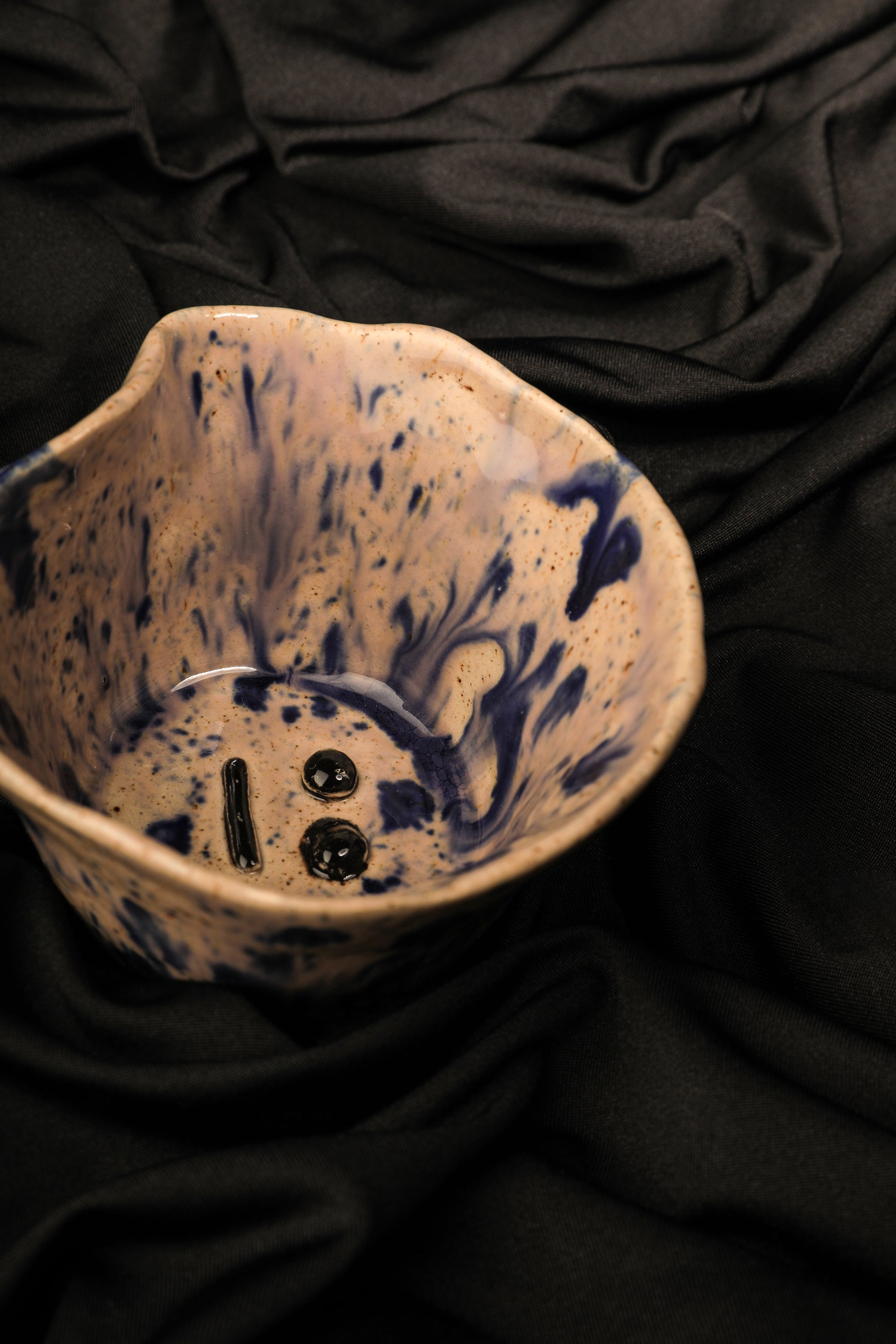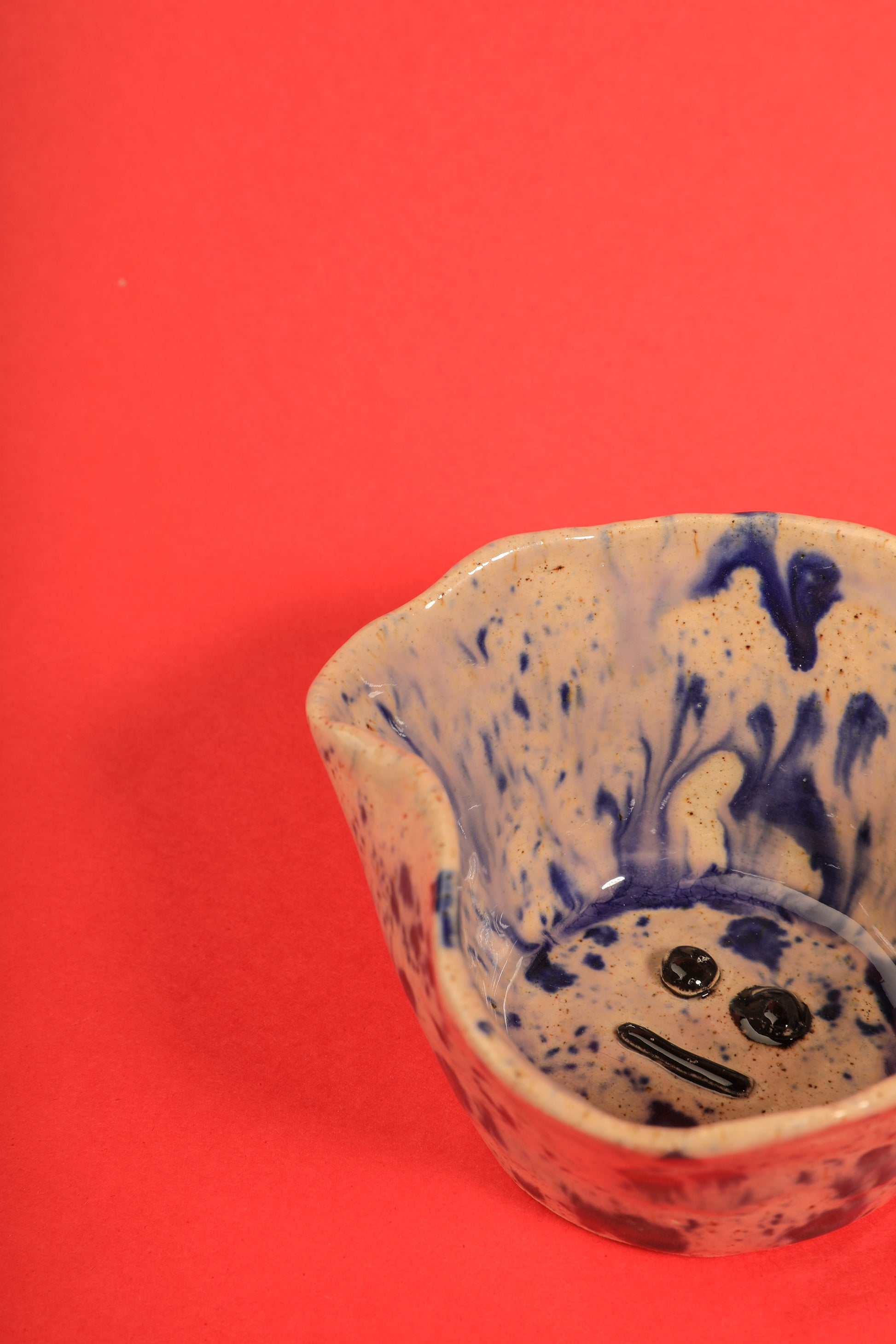 Façonné en terre blanche, il se pare d’un émail moucheté rose et bleu, qui vient adoucir son air boudeur. Ces petites tâches colorées apportent un côté pétillant, comme pour rappeler que même dans les moments où l’on traîne des pieds, il reste toujours un éclat de joie ou une note de couleur pour égayer la journée. L’émail noir dessine ses traits et souligne son regard à la fois simple et expressif, donnant à la pièce son caractère unique.