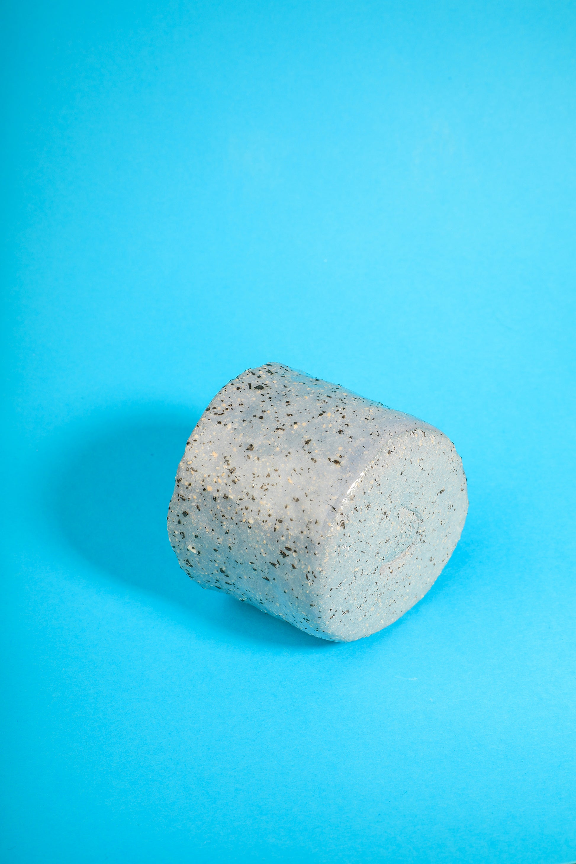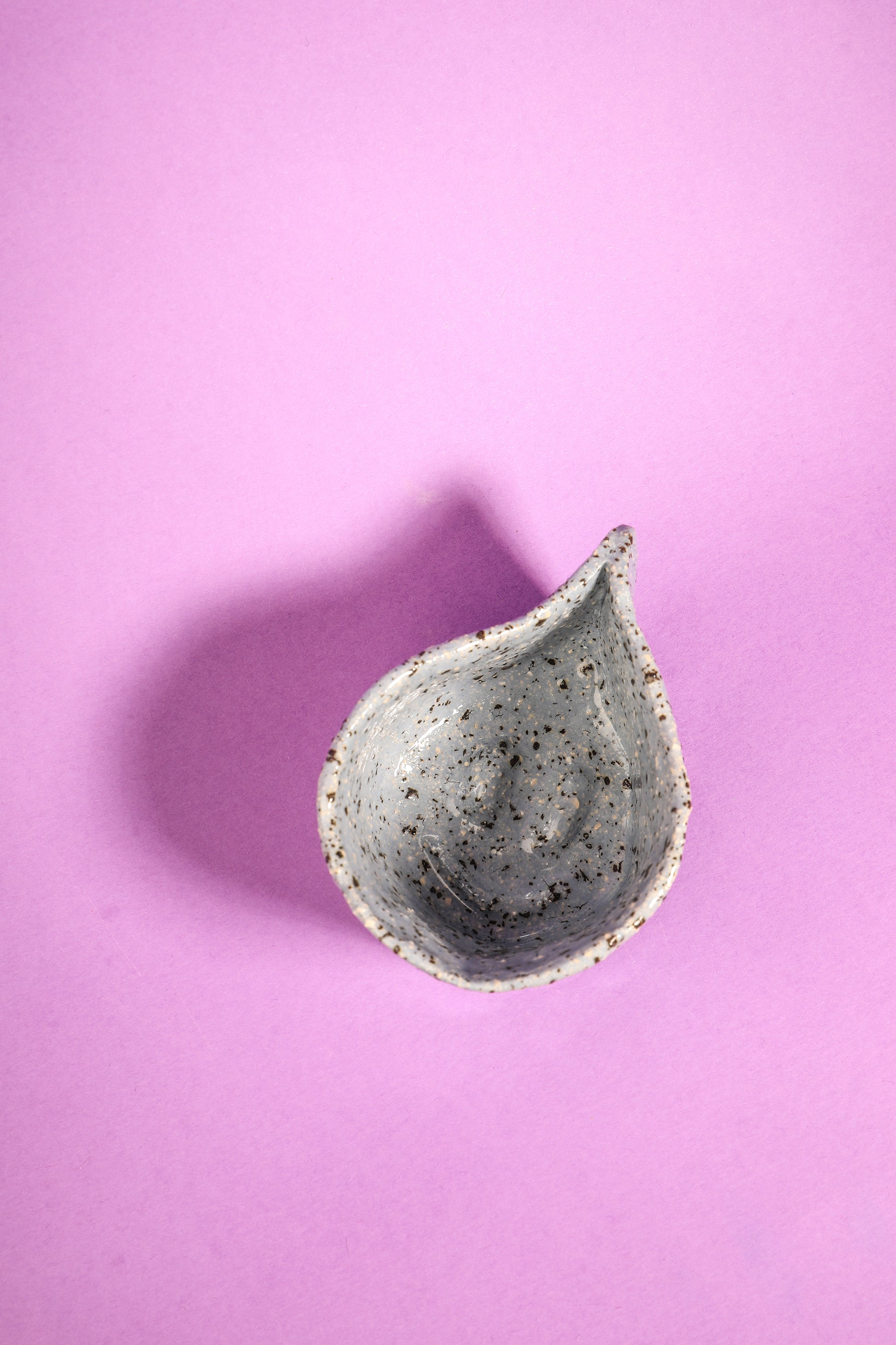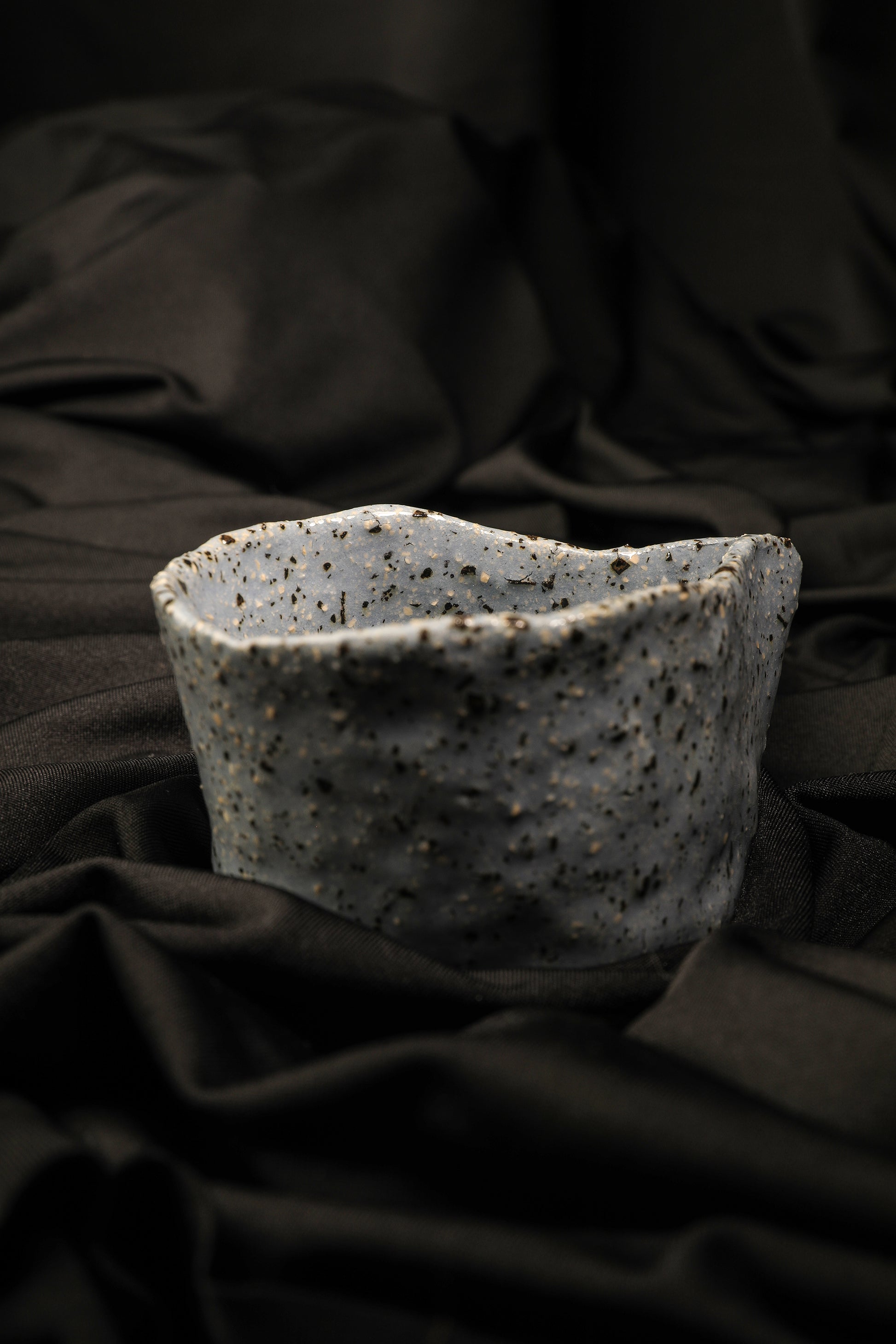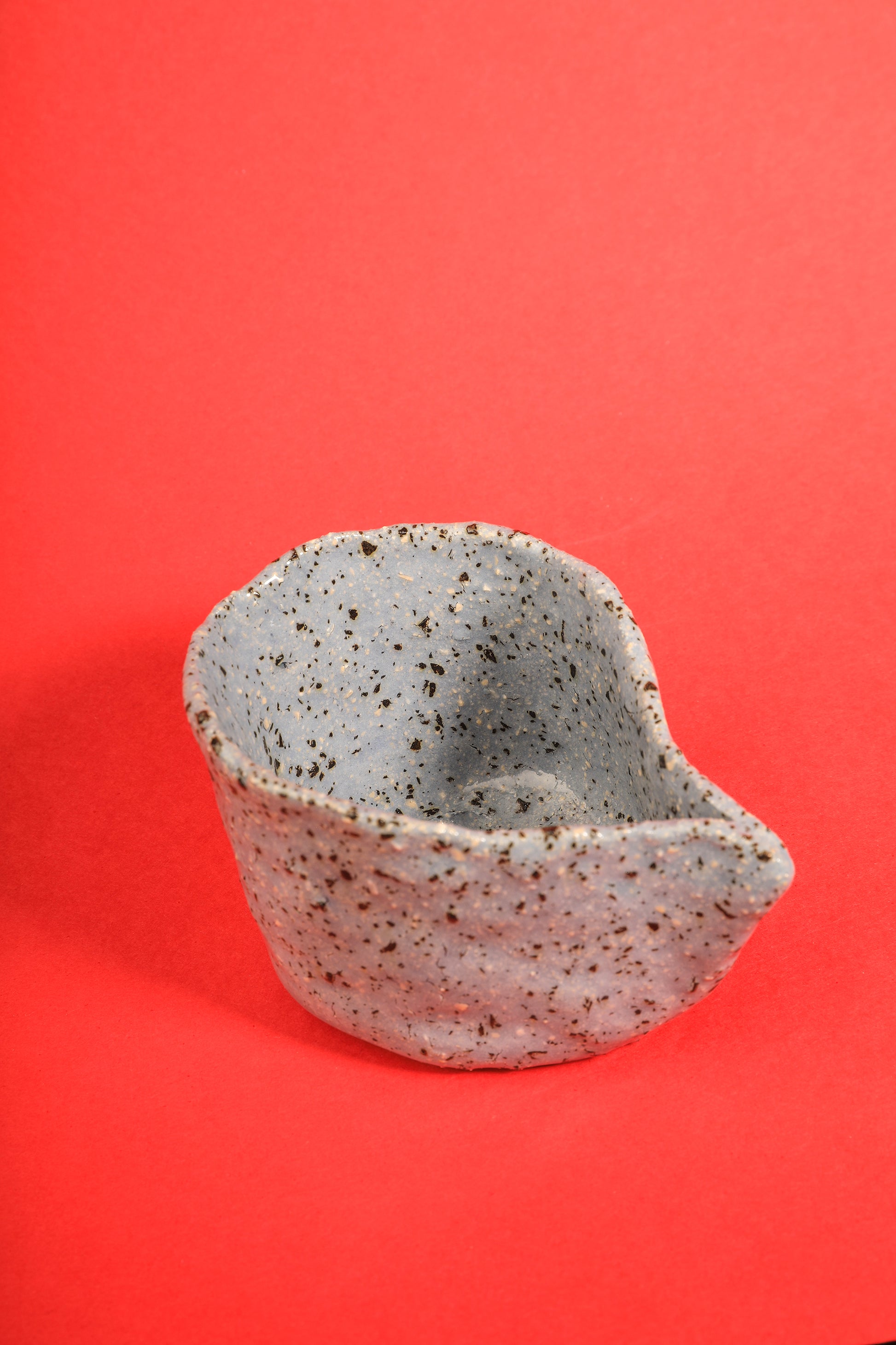 Ce petite tasse, qui pourrait aussi bien devenir un pot à sauce, est un objet hybride, simple et plein de caractère. Confectionné en terre bleue, il révèle sous son émail transparent une surface vivante, où de minuscules points et éclats noirs apparaissent comme de petits cailloux venus se loger dans la matière. Ces détails lui donnent une texture organique, presque minérale, comme si le pot avait poussé naturellement dans la terre.