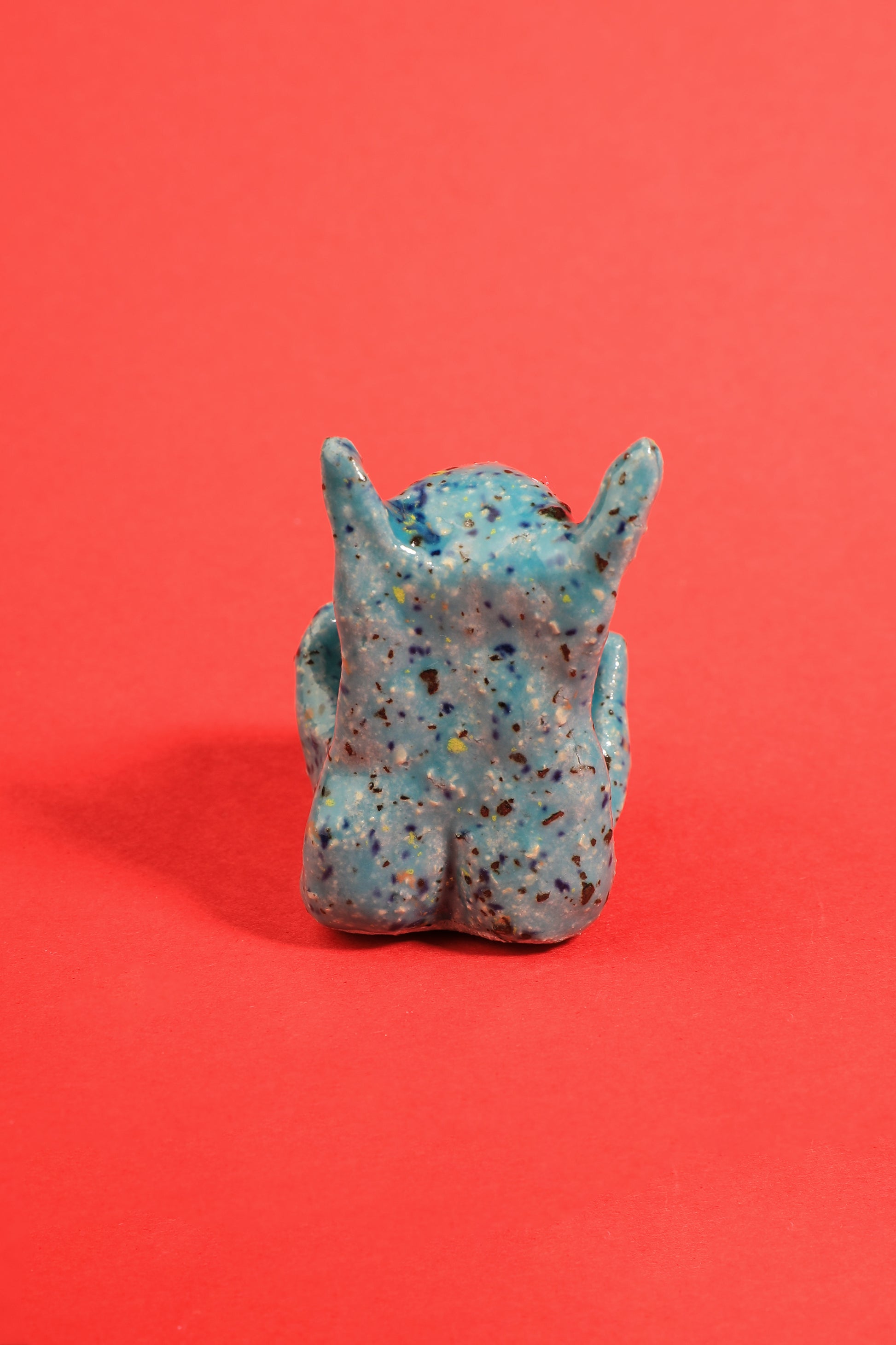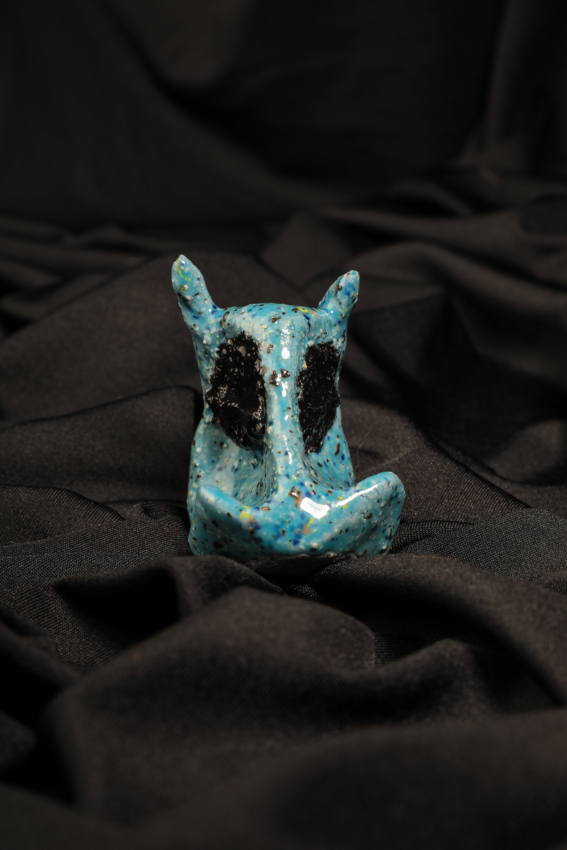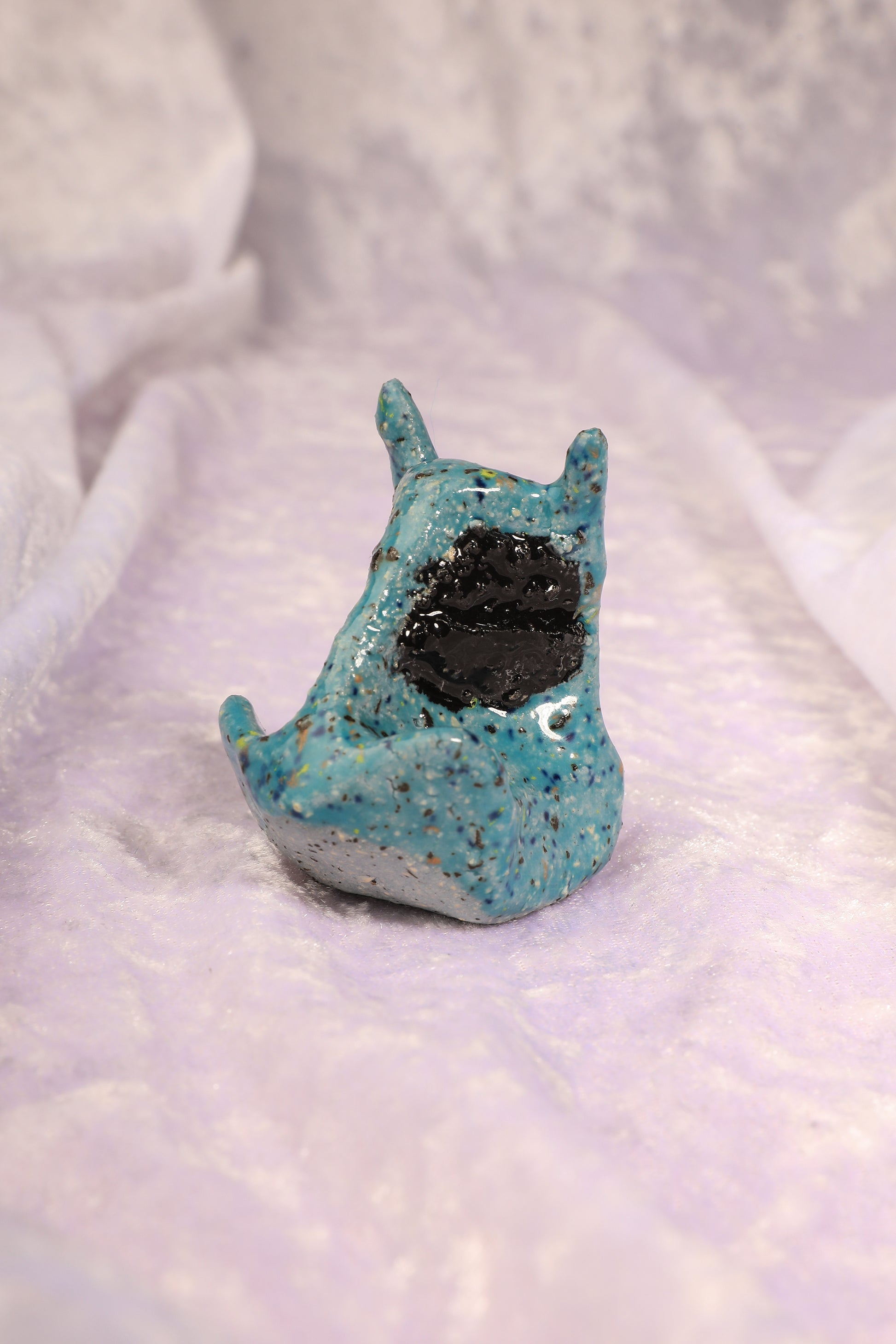 Cette petite créature semble s’être échappée d’un rêve étrange et merveilleux. Son corps bleu profond, parsemé de nuances mystérieuses, évoque à la fois la douceur de l’imaginaire et l’ombre discrète des mondes secrets. Ses yeux noirs intenses lui confèrent une présence à la fois mignonne et énigmatique, comme un compagnon moitié tendre, moitié sombre, qui veille sur vos trésors en silence.