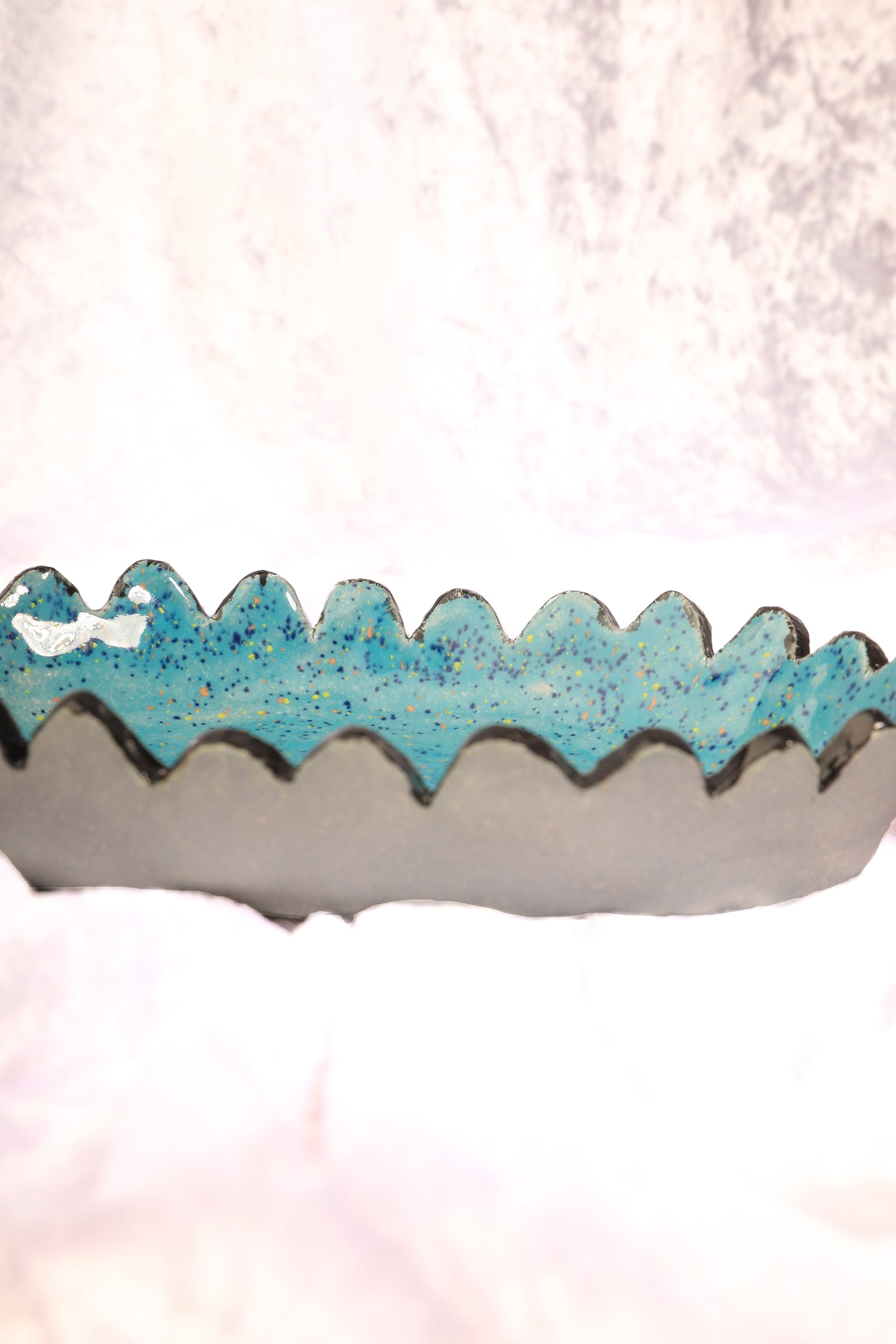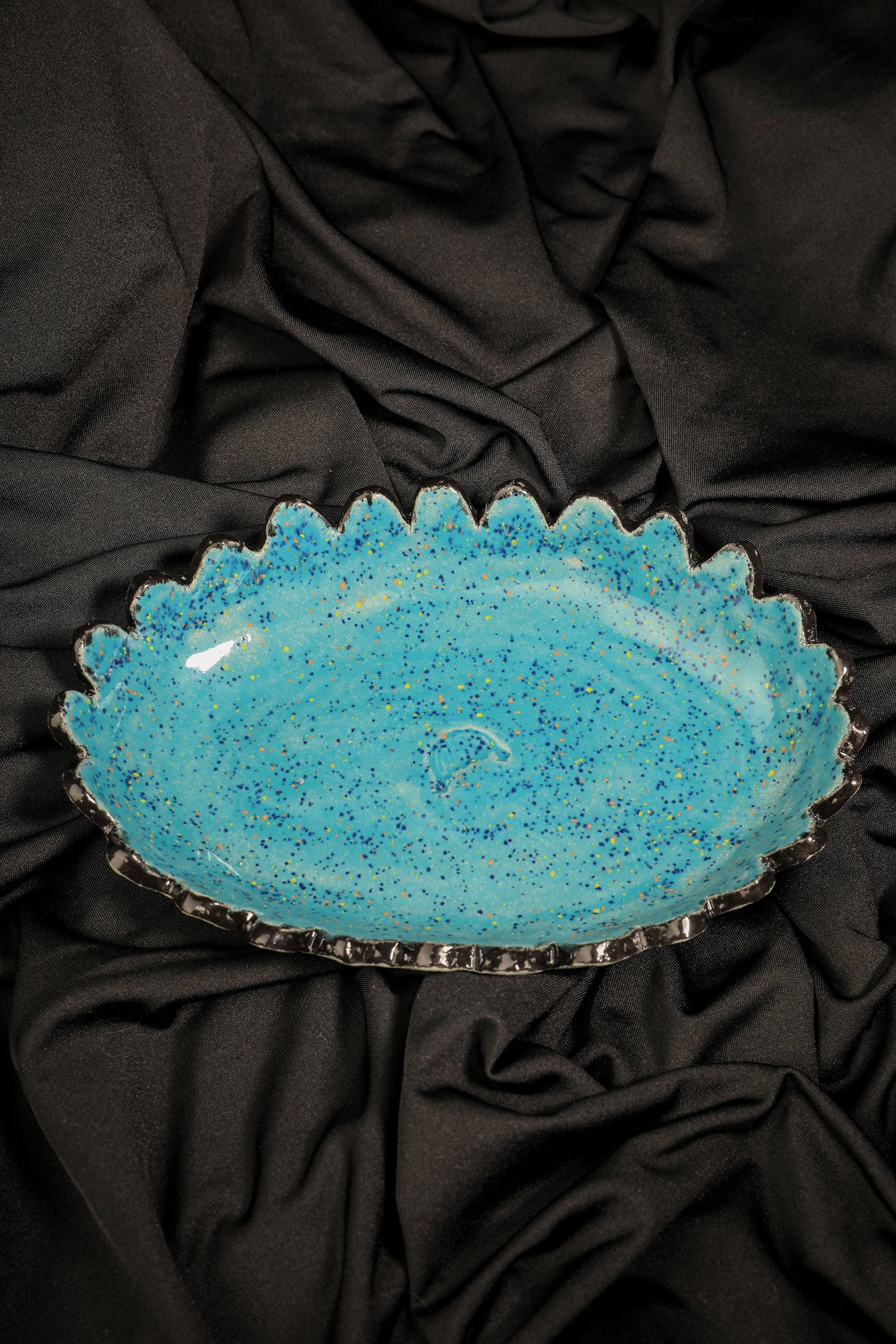 Ce plat à apéro semble avoir éclos comme une fleur d’été figée dans la terre. Ses bords délicatement ondulés, noirs comme tracés à l’encre, évoquent des pétales qui s’ouvrent sur l’intérieur vibrant. Le bleu, parsemé de petites touches plus sombres, rappelle les reflets changeants de l’eau lorsqu’elle capte la lumière. À l’extérieur, la terre brute, laissée sans émail, offre un contraste naturel et authentique, comme une écorce qui protège un cœur précieux.