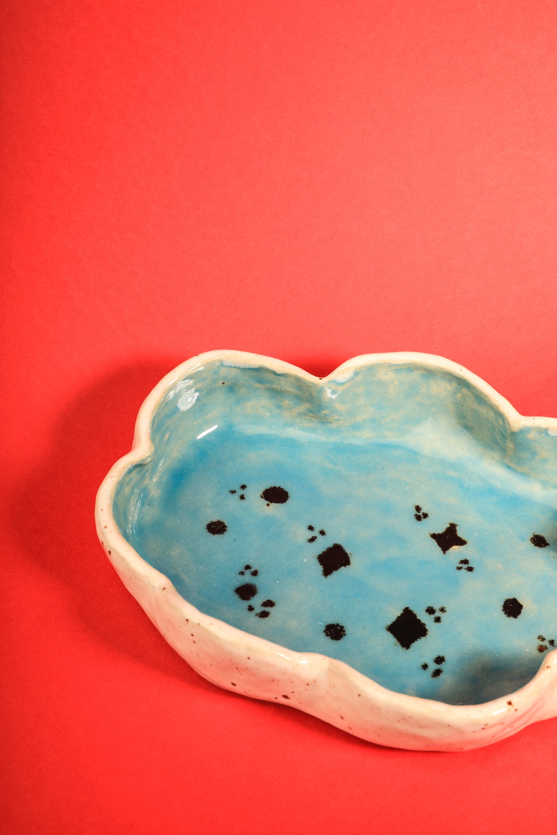 Ce plat à apéro a la forme d’un nuage,comme s’il avait été cueilli directement dans un ciel de rêve. Son extérieur blanc évoque la douceur cotonneuse des nuages qui voguent lentement, tandis que son intérieur bleu dévoile un petit univers secret. Les étoiles noires qui pétillent à l’intérieur rappellent un ciel nocturne illuminé, offrant à la pièce un contraste magique et apaisant.