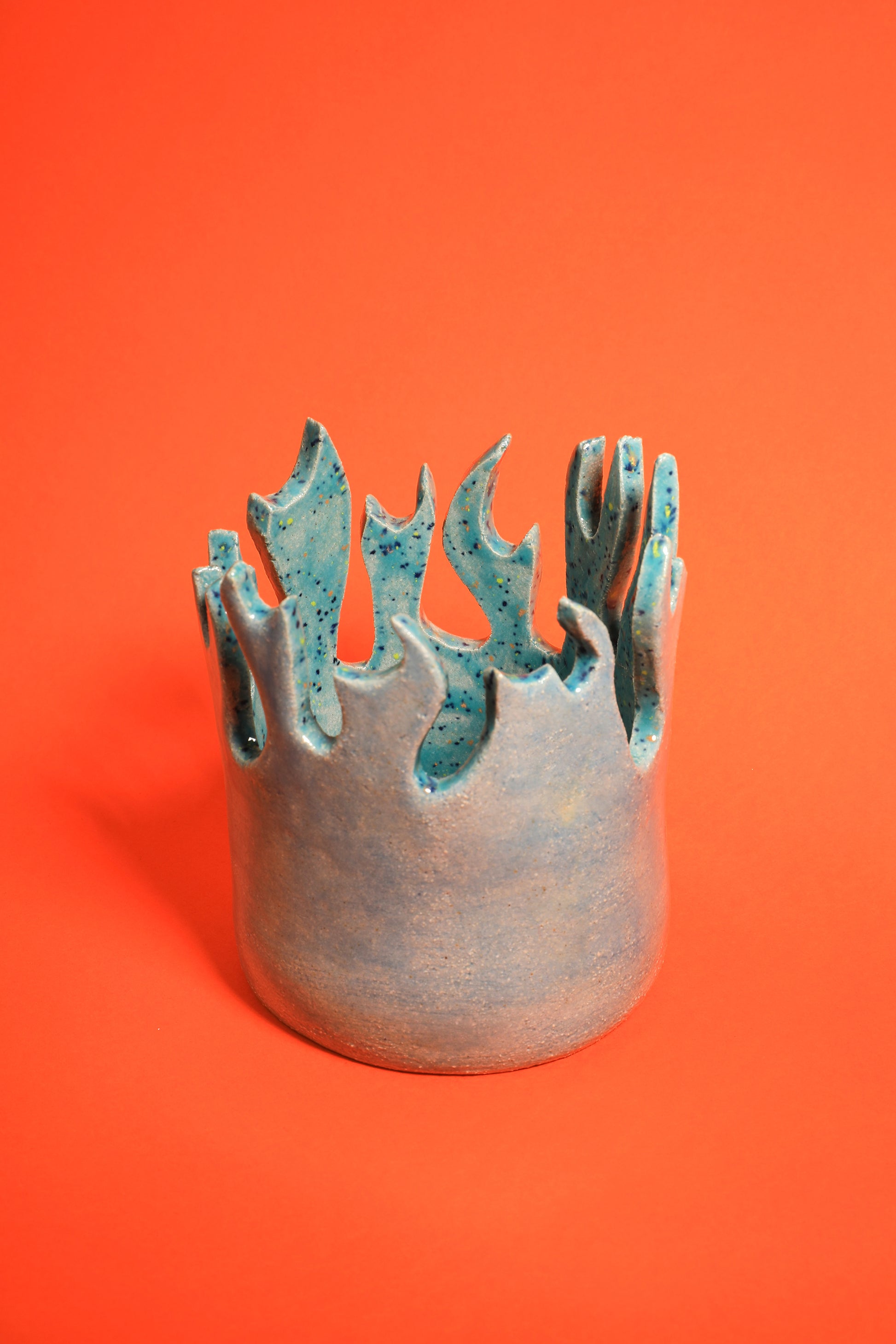 Inspiré par l'univers du skate et l'audace graphique de Thrasher, ce pot allie énergie brute et poésie artisanale. Il incarne aussi une histoire personnelle : celle des débuts de Courte Frange, où les flammes ont marqué la première étincelle créative. Aujourd'hui, la série renaît, déclinée en nouvelles couleurs, comme une promesse de renouveau et d'exploration.