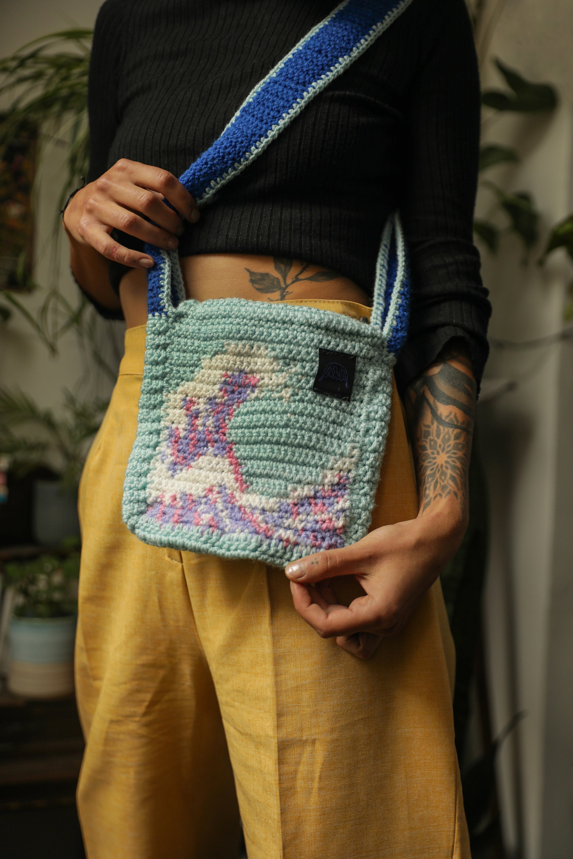 Ce sac au crochet rend hommage à la Vague de Kanagawa du peintre Hokusai avec ses nuances de bleu transformées en couleurs pastel et son motif puissant. Réalisé patiemment à la main, il allie art, originalité et savoir-faire textile. Il apporte une touche unique et poétique à chaque sortie, comme une vague de créativité à l'épaule.