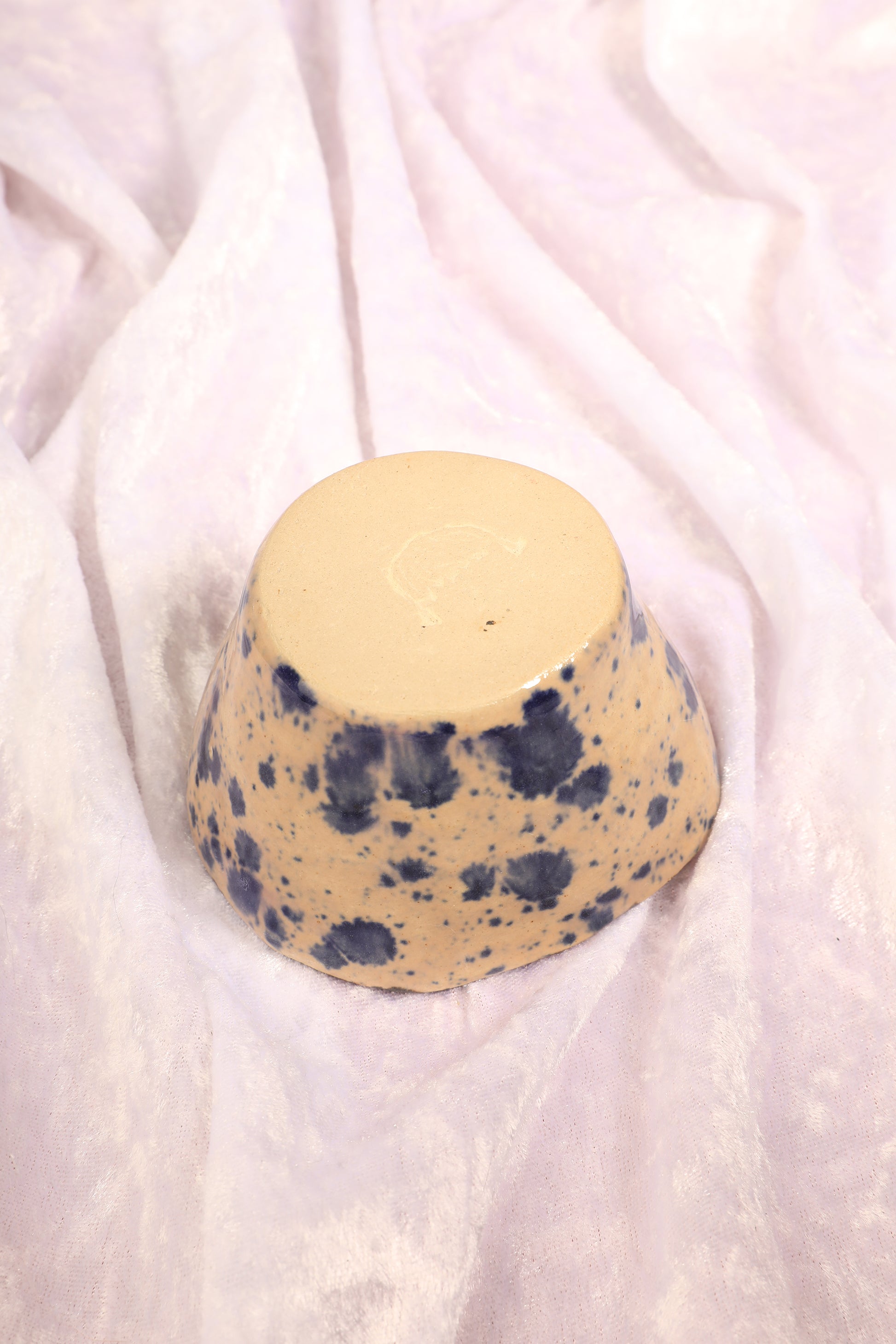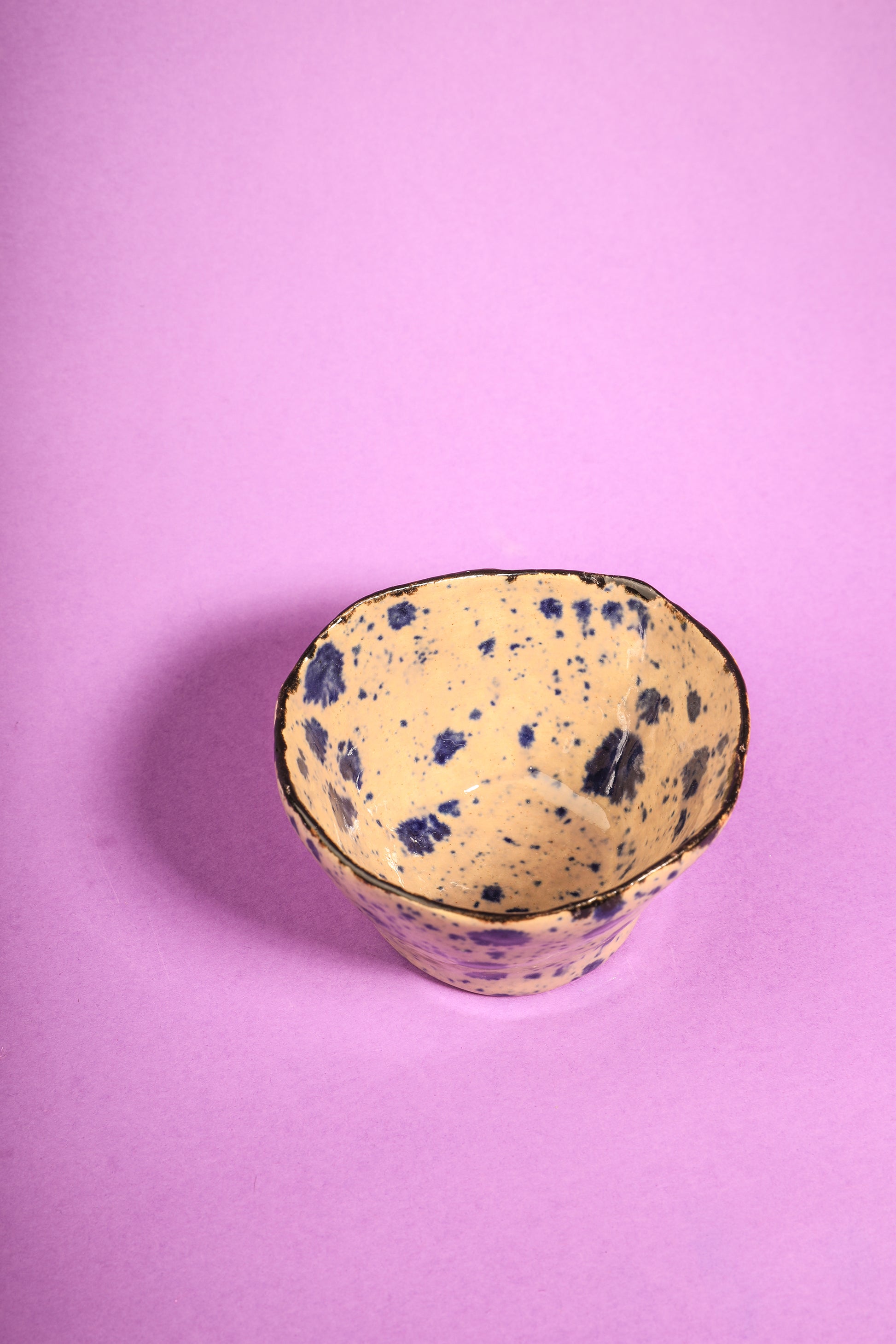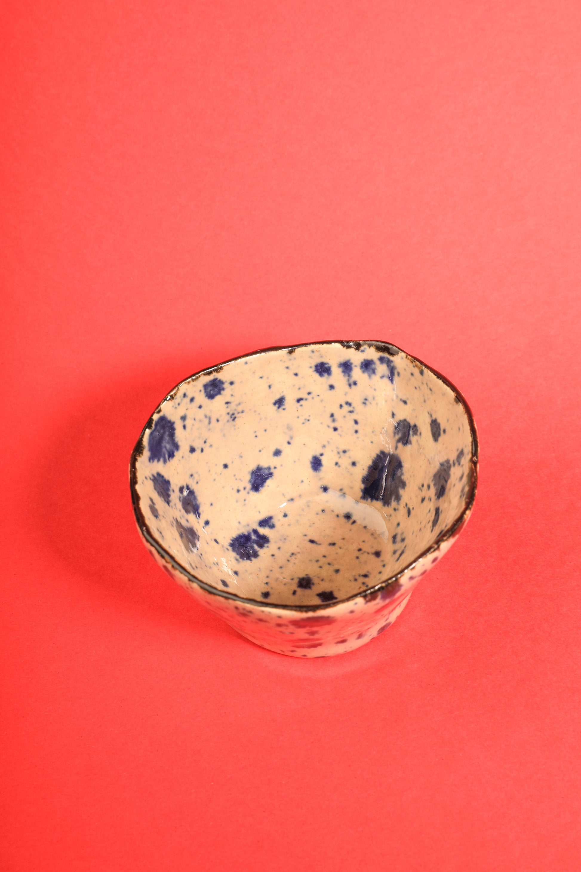 Cette tasse évasée semble avoir été façonnée pour capturer la douceur d’un matin calme. Son rose délicat, moucheté de bleu, évoque un ciel teinté de rêve où la journée commence doucement, tandis que son bord noir affirme une présence élégante, comme un trait d’encre qui souligne un dessin poétique. La forme ouverte invite à plonger dans son contenu avec légèreté, comme si chaque gorgée devenait un petit rituel apaisant.